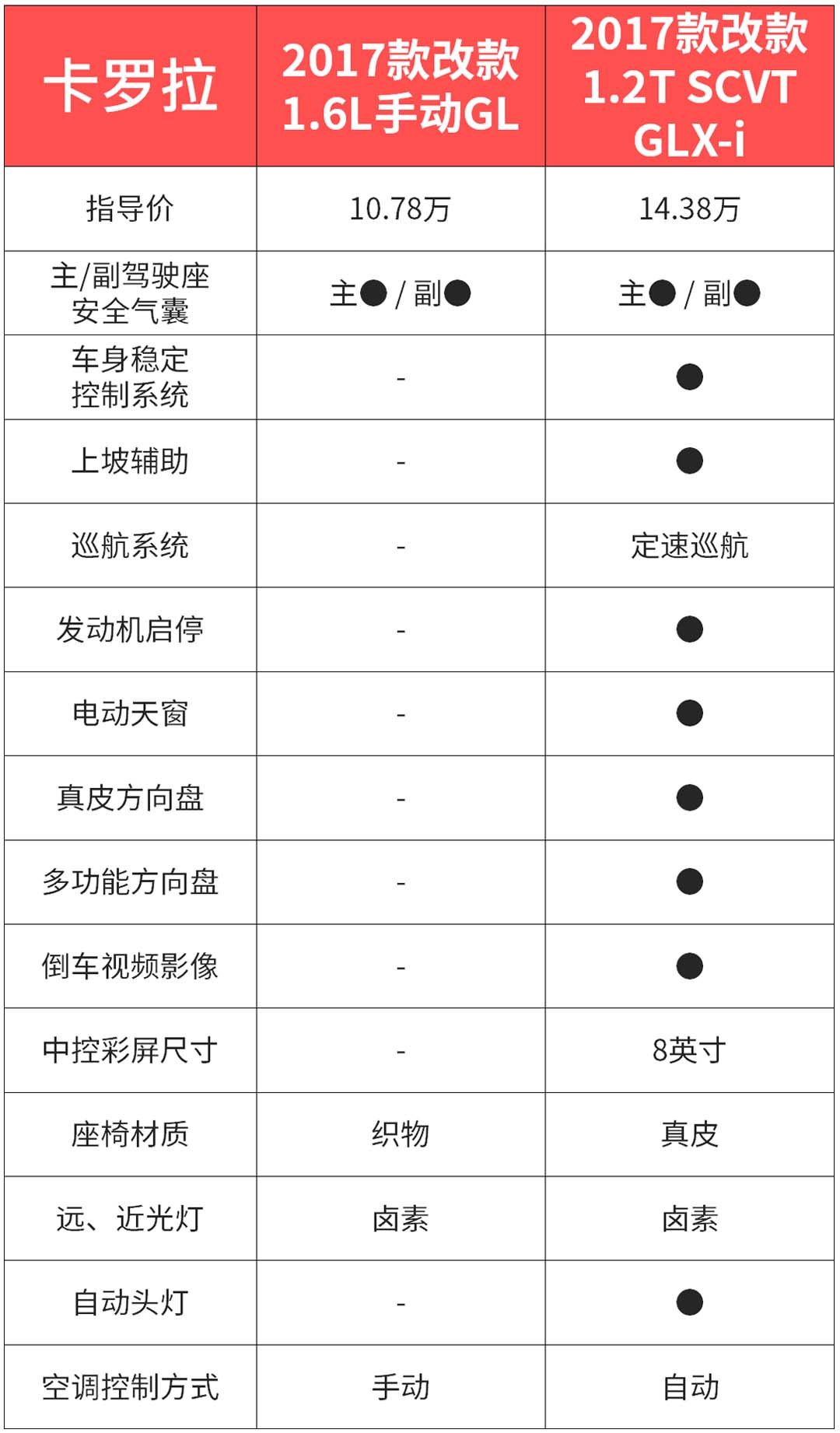 如果你还是坚定地买合资车,那么通过对比你就会发现,你买的车高低配相差实在是太大了。就拿卡罗拉来说,17款低配手动连ESP都没有,一些有用的配置如倒车雷达也没有。再看高配,除了动力上有差别外,高配也确实增加了很多实在的配置,起码看起来比低配“高级”多了。不过价格相差差不多4万,更重要的是国内经销商并没有为用户提供个性选配,都是采用了捆绑销售的手段,加装的配置花了大价钱不说,也增加了一些我们并不需要的配置。