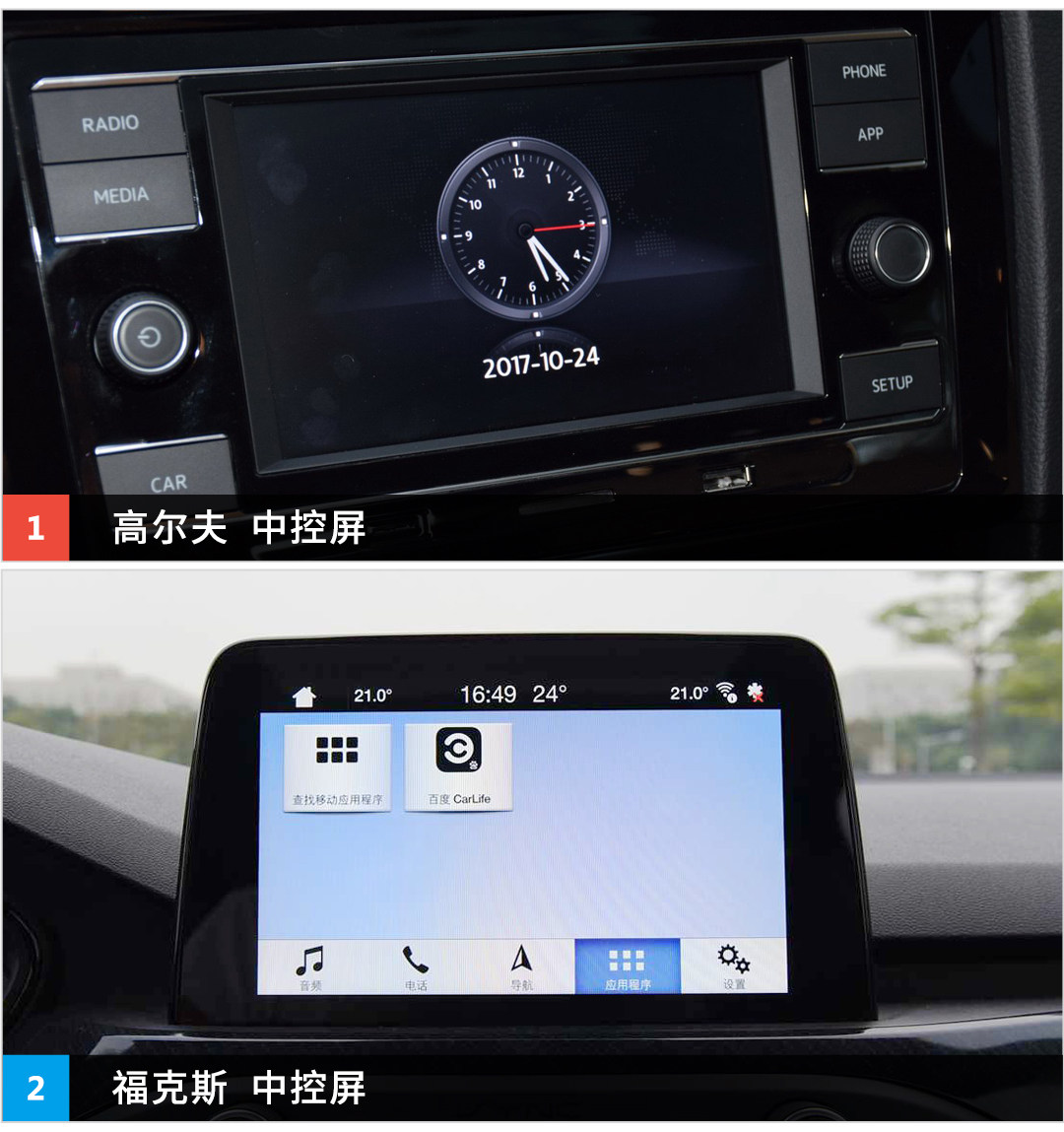 两款车型均采用8英寸中控屏,但在设计上有所区别,高尔夫的中控屏采用内嵌式设计,而福克斯为悬浮式设计,后者会更方便驾驶员在行驶过程中对其进行操作,这次,我站福克斯。