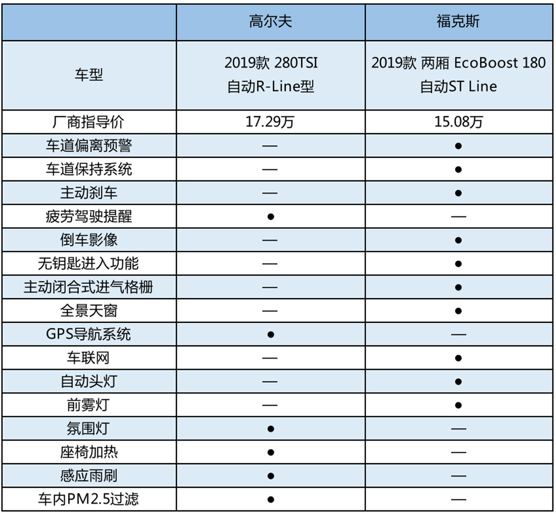从配置对比中我们就能看出,福克斯ST Line的配置全面性要高于高尔夫R-Line,像车道保持、主动刹车等多项安全配置以及车联网等便利性配置上,福克斯确实更为全面,经历了换代在配置上存在较大提升这是正常的。