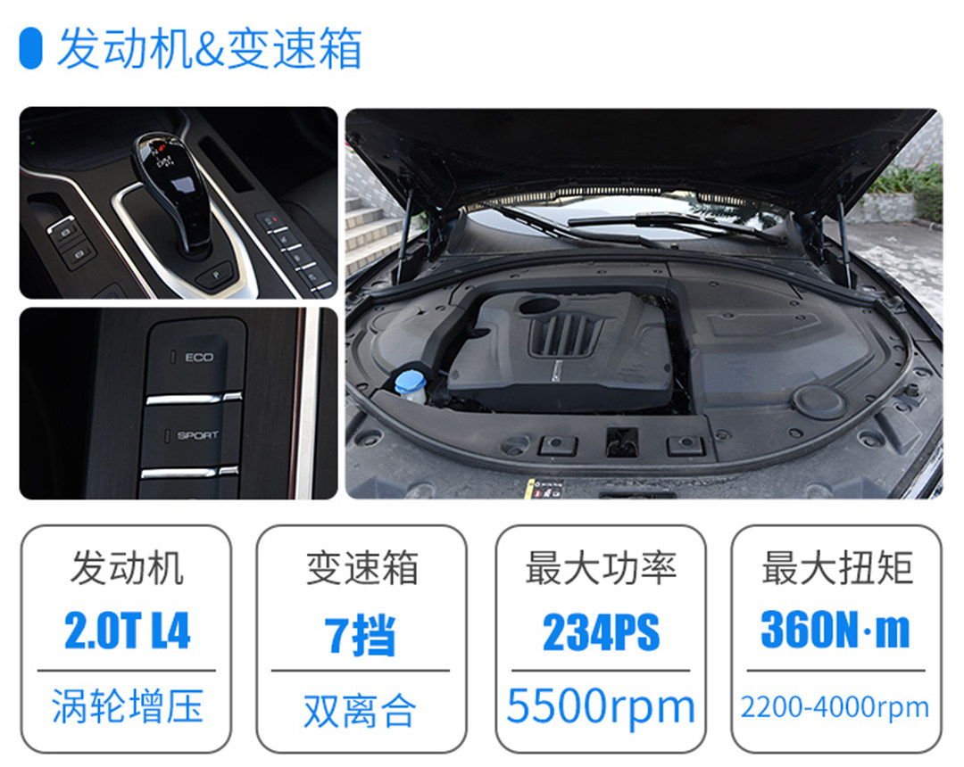 动力系统上,新车没有做什么调整,2.0T发动机能输出的最大马力为234Ps,峰值扭矩360N·m,匹配7速双离合变速器。