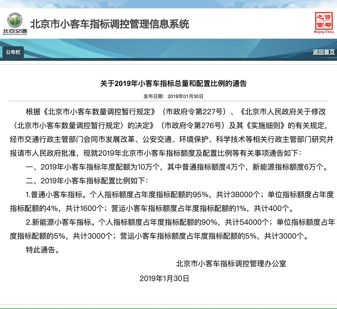 1月30日,北京市小客车指标调控管理办公室发布《关于2019年小客车指标总量和配置比例的通告》。《通告》显示,在2019年,北京市小客车指标年度配额总数为10万个,与2018年的配额总数齐平,其中普通小客车指标(燃油车)为4万个,新能源指标为6万个。北京的普通车指标采取摇号政策,而新能源指标采用轮候配置政策(排队),而去年12月份北京申请和确认延期的新能源指标达到421536个,因此在2019年新申请新能源指标的消费者要在8年以后才能获得购买新能源汽车的机会。