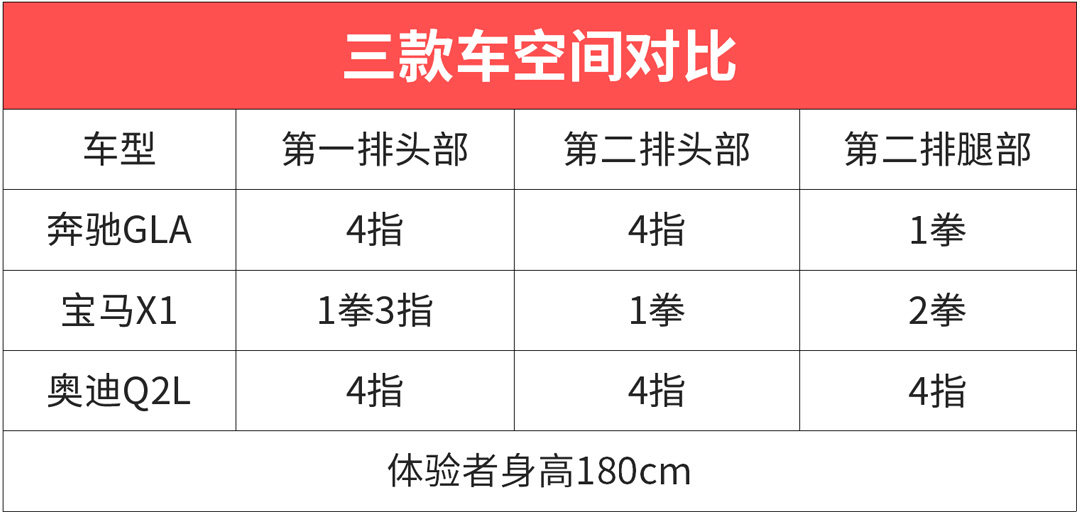 虚荣心也有高低起伏,平淡下来之后就要考虑现实的问题了。来看一下这三款车的空间表现能力,奔驰GLA和奥迪Q2L只是刚刚满足乘坐的需求,坐得舒适就不要想了。宝马X1的空间比两者大,但价格比两者贵上几万块。而且三车后排中间位置隆起较大,都不太适合成年人乘坐。空间上确实还是同价位的冠道、汉兰达等要有优势。