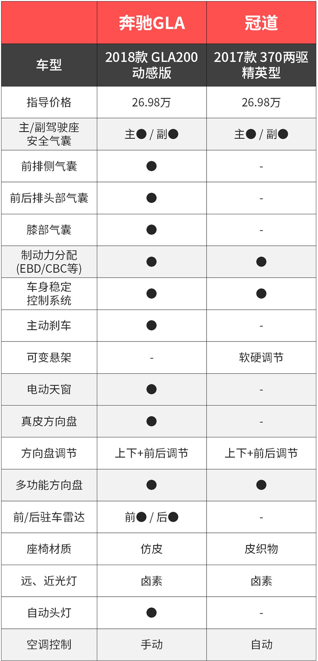一听到乞丐版,很多人的印象中就是配置很低,不过这三辆车就是乞丐版也是有着不小的惊喜,看来买车并不只是买了个标。同样价钱的奔驰GLA与冠道配置相差无几,甚至GLA在某些配置上比冠道还要好,安全性上是GLA更好一点,除了标配6气囊外,还多了头部气囊,看来就算是BBA的入门车型也不是花架子。