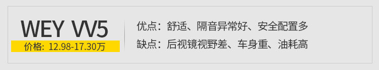 WEY的车型外观走的都是运动风,VV5和VV7都是coupe型风格。但是动态表现就完全走舒适风,隔音表现完全可以媲美更高级的豪华品牌。VV5内后视镜几乎没有实用性,一定要有流媒体后视镜。VV5的车身比较重,油耗非常高。