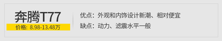 一汽的诚意之作。外观凌厉科幻、内饰轻奢潮流。中控台上有一个全息显示屏,显示的是一个拟人化的语音助手,这个语音助手是一个动漫小姐姐,有五套皮肤,不知道奔腾以后会不会以卖皮肤为生。1.2T的动力一般,好在不是三缸。底盘滤震很难跟哈弗H6等主流产品对比。不过奔腾T77售价为9-13.5万之间,还是可以形成错位竞争的。
