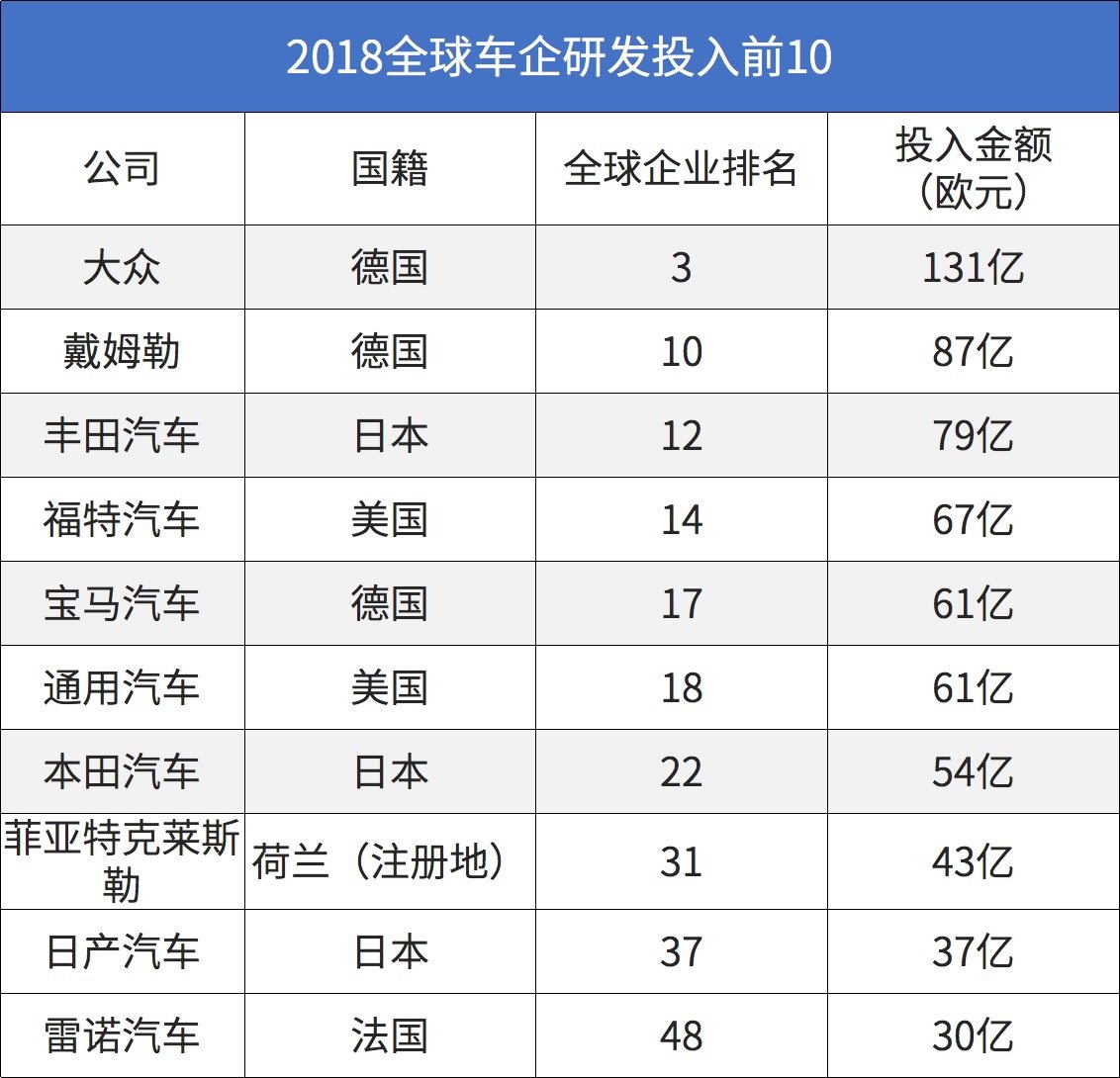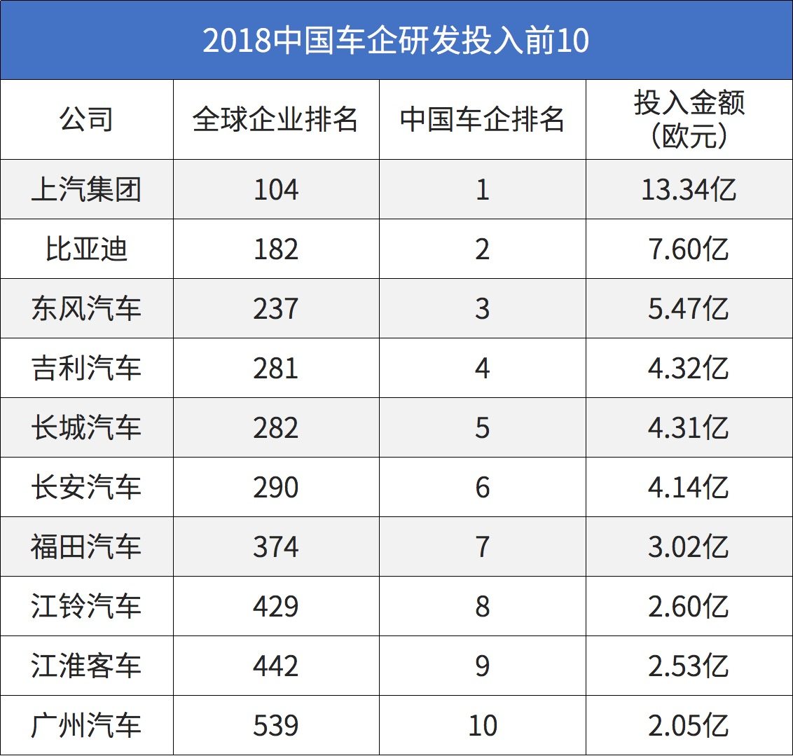 据2018年欧盟工业研发投资记分牌的数据显示,我们可以看到大众集团以131亿欧元的研发投入,在全球的研发投入中,位列第3名。接下来分别是戴姆勒、丰田、福特,以87亿、79亿、67亿,位列第10、12、14名。而在自主品牌方面,则有12家品牌入围前700强,上汽集团以13.34亿欧元的投入,位列第104位;紧跟着是比亚迪,以7.60亿欧元位列182名。