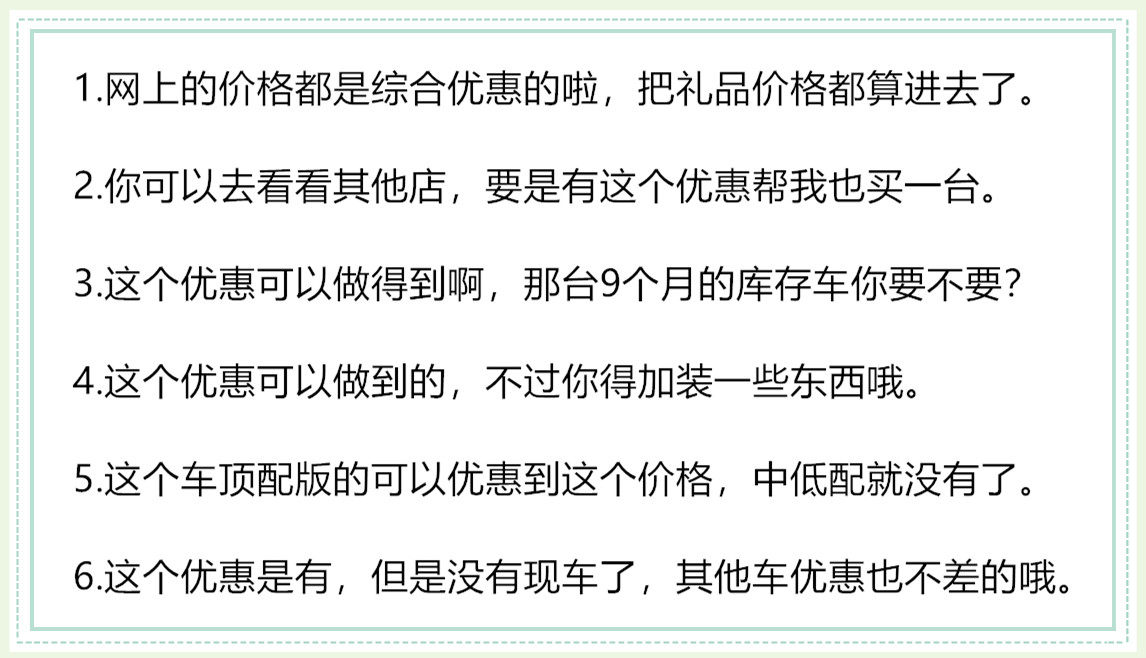 首先要知道的是网上的报价都是有水分的,大部分的报价都是为了吸引你到店看车,等你到店后销售的话术无非就是下面几句。