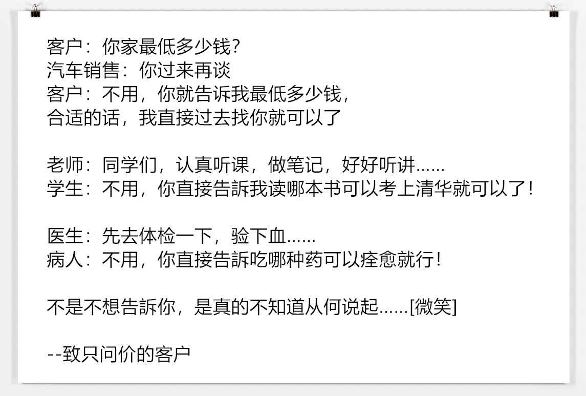但正所谓吃得苦中苦方为人上人,当你只是面对一名汽车销售的时候,他们曾经面对过无数像你这样的客户,再奇葩的客户在他们眼里也是习以为常,甚至是茶余饭后调侃的对象,苦中作乐的段子。