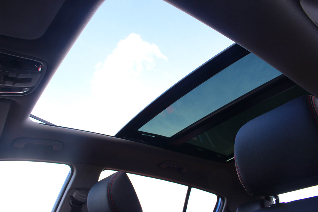 头顶上的全景天窗采光面积较大,并且能上掀式打开。