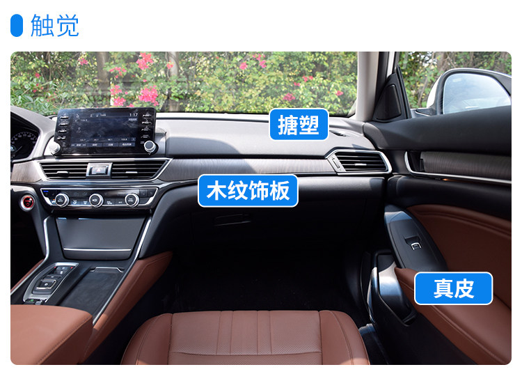 INSPIRE的用料在同级来说处于主流水准。不过,本田这套内饰用料设计很用心。副驾座面前的面板,杯架的面板都用了木纹饰板,中控台下方的盖板是一个磨砂塑料,这些材料都是不留指纹的。