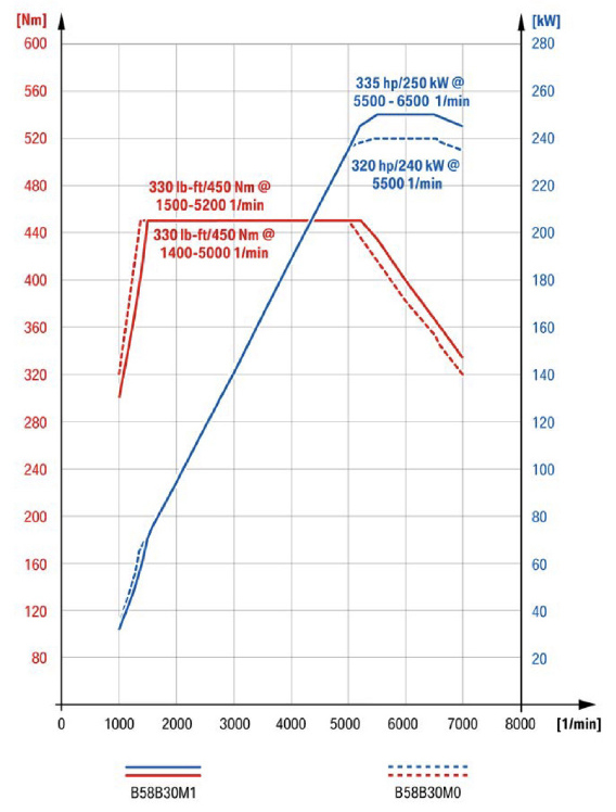 由于推出的时间比较早,在电气化这方面B58是不如M256的,不过在模块化以及效率方面,B58仍然有优势。首先B58的压缩比高达11.0:1,在涡轮增压引擎中这算比较高的,高压缩比意味着高效率,但是对增压发动机来说高压缩比容易引起爆震。B58发动机能用11.0:1的压缩比,说明它的燃烧控制以及热管理做的非常好。