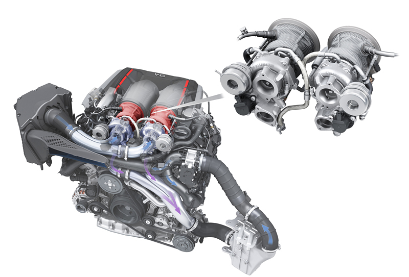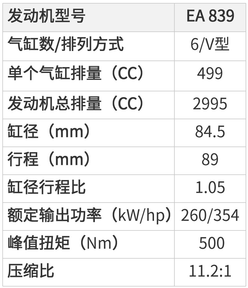 EA 839只配备了一个涡轮增压器,不过它也是双流道设计,大致原理和大家熟知的单涡轮双涡管差不多。不过EA 839的涡轮布置在V型发动机90度夹角中间,这样大大缩短了排气总管与涡轮的距离,提高了动力响应。