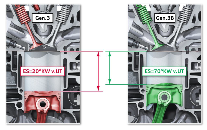 EA839的设计理念又有所不同了,它使用了目前比较流行的双循环技术,也就是奥托循环+米勒循环,奥迪或者大众将米勒循环称为B循环,B是大众集团一位工程师的姓氏。国内的EA888 Gen3B 后面字母B也就是米勒循环。