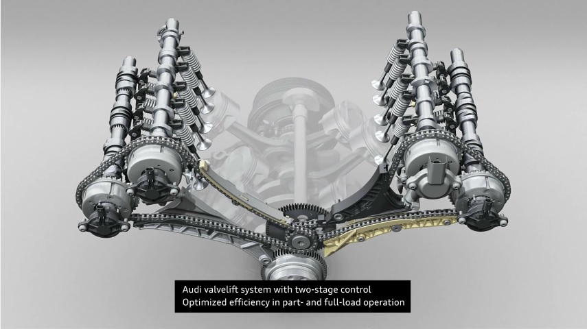 EA839的四个凸轮轴都可以调节气门正时,另外进气凸轮轴还采用了AVS技术,既气门升程调节,这个AVS技术也用在国产的EA888 Gen3B上。通过缩短排气管与涡轮的距离,并调节气门正时和升程,奥迪3.0T双循环发动机也有不俗的动力表现。