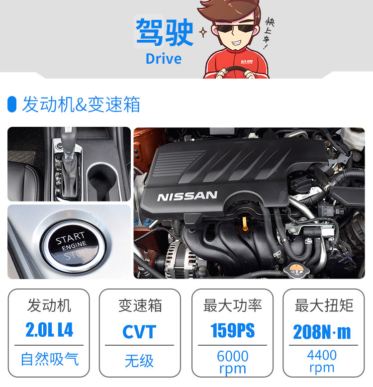 而说到新一代天籁,大家一定会对它的2.0T涡轮增压发动机非常感兴趣,但此次试驾的是2.0L车型,这一款自然吸气发动机在动力参数方面表现一般,搭配CVT无级变速箱能够带来非常平顺舒适的行驶感受;初次驾驶的人也许会觉得新一代天籁2.0L版本在起步时动力响应迅速,提速轻快,但这或许是由于油门调教更加激进,在静止起步时会带来更大的节气门开度,从而获得轻快迅猛的起步感受。