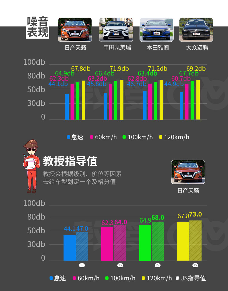 噪音控制的提升也是新一代天籁的亮点所在,测试中天籁的整体噪音水平优于大部分同级对手,更是明显低于同级车型的平均值,车厢静谧性表现非常出色。