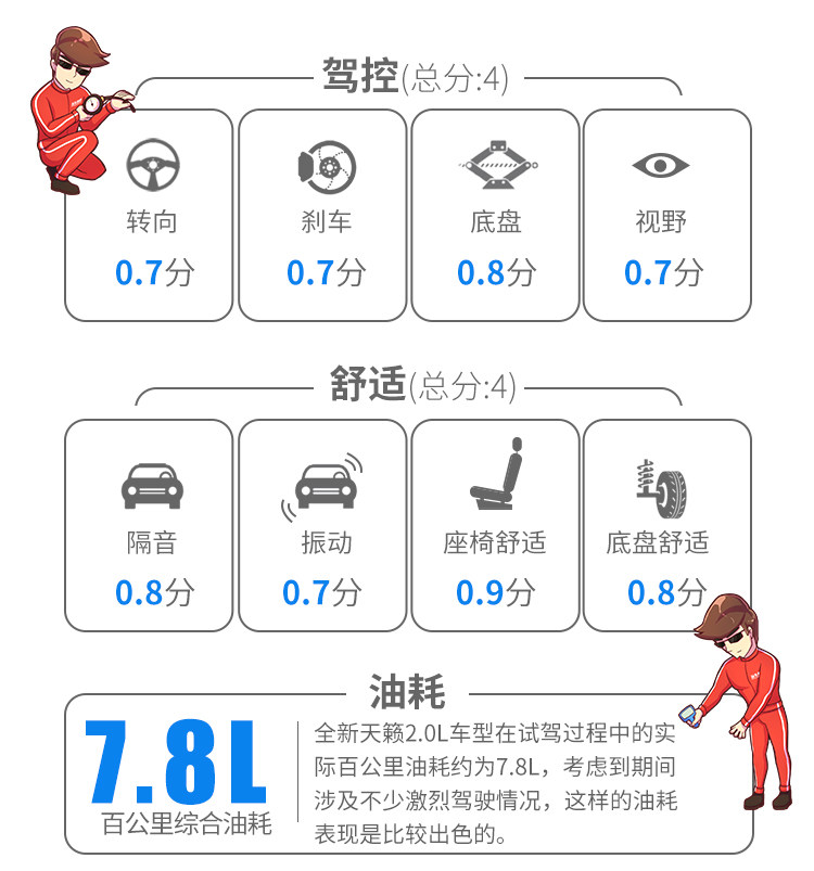 经过试驾,可见新一代天籁在设计部分确实实现了年轻化、运动化的改变,而车内空间和座椅舒适性表现也令人满意;只可惜2.0L车型的驾驶感受部分仍未能带来运动感受,而底盘调校也依然明显地偏向舒适性,可以说天籁的这一次换代并不能让运动化的气息充满全身。如果你想要购买一款行驶平顺、驾驶轻松且乘坐舒适的家庭轿车,新一代天籁依然是一个不错的选择;但如果你是一个追求运动化的消费者,那么也许你更应该选择2.0T车型。