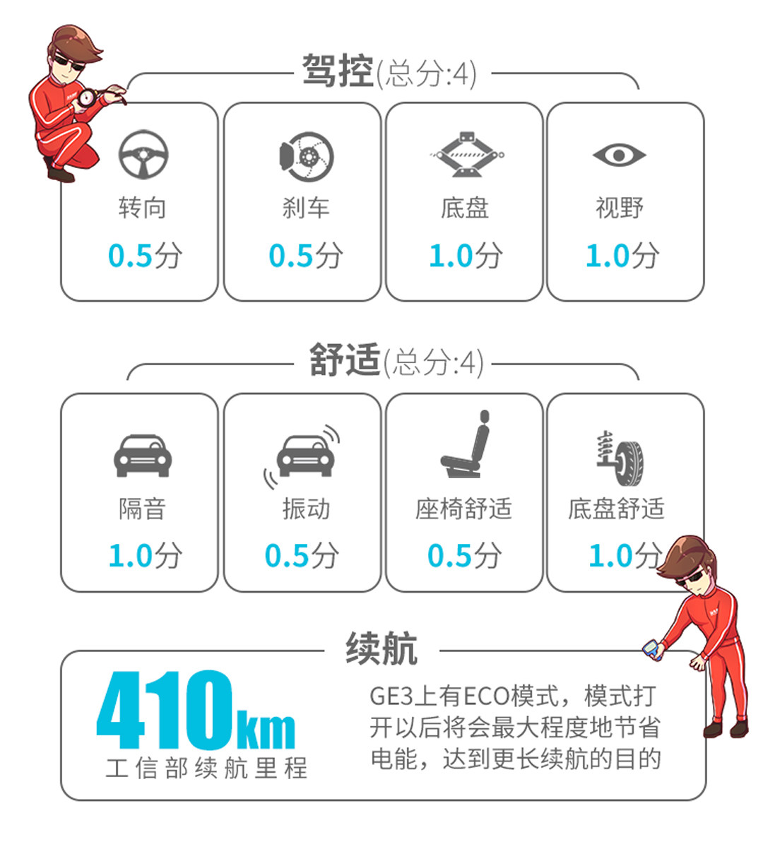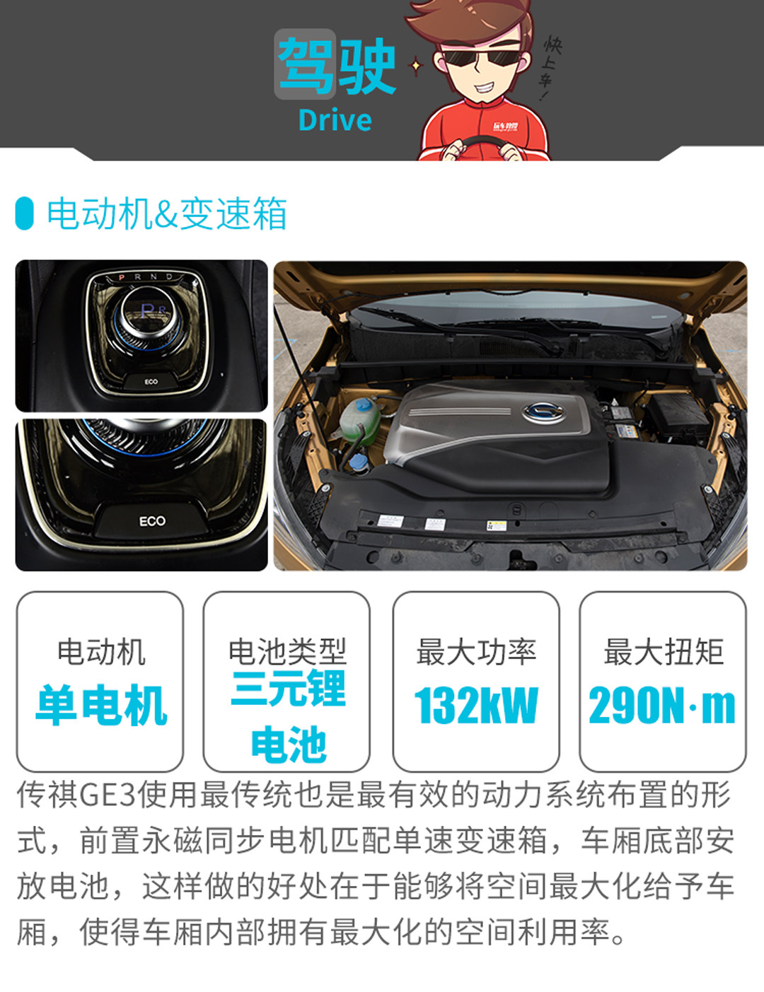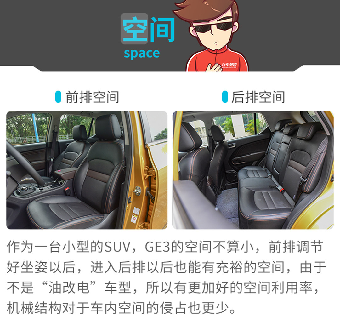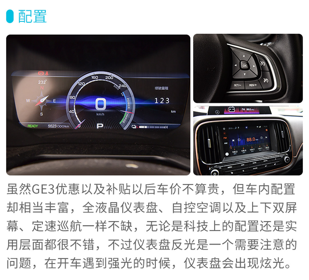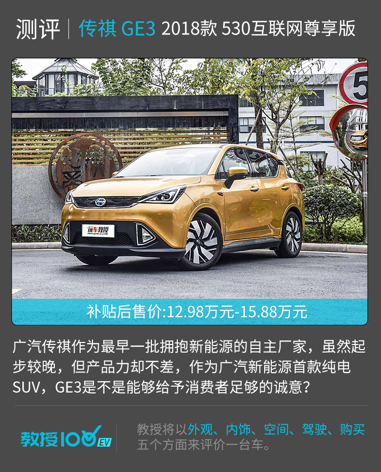 总的来看,GE3是一台适合日常代步使用的经济实用纯电SUV,它没有那些高端SUV华丽的外表,也没有豪华的内装,它就是一台能够为你遮风挡雨,给你出行方便的车辆,在日常城市里面穿梭毫不费力,但你需要适应它的一些小脾气,例如相对偏重的专项等小缺点以后,你就会发现GE3续航、乘坐的感受都是同级别上游水准,而更重要的是,补贴以后只要12.98-15.58万就能拥有一台具有原创设计的、多功能的SUV。