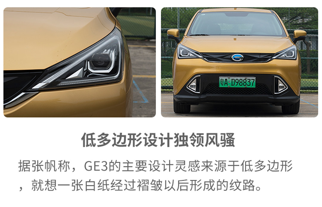 据广汽传祺总设计师张帆称,GE3使用低多边形作为设计灵感,最直接的方法就是将一张白纸揉成一团,然后平铺开来,纸上会形成一些低多边形,而GE3车头灯多处设计元素均来自此,棱角更加分明的前大灯是整个车头的点睛之笔,加上下方的雾灯,形成了GE3独特的设计语言。GE3没有取消掉中网的设计,所以让整个车头看起来更加符合主流的审美,同时在黑色的中网处同样使用低多边形的设计。