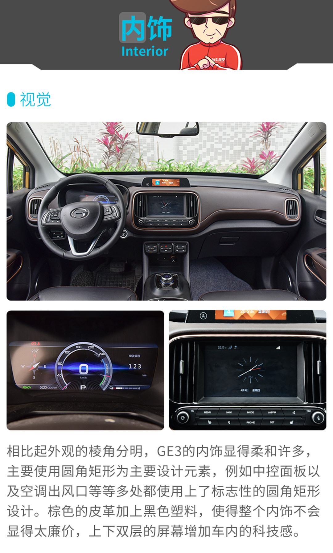 在设计上,GE3做到了业内顶尖,车内多处具有标志性的圆角矩形设计元素,例如中央显示屏、空调调节区域以及空调出风口都是圆角矩形的设计,相比起棱角分明的矩形设计,圆润的造型更加平易近人,再加上金色缝线以及装饰件的加入,让车内增加了一些个性的气质。棕色皮革加上黑色塑料的搭配,虽然没有特别高大上的感觉,但整体以顺眼为主,没有过分的为了设计而设计,整体来说是一套成功的内饰。