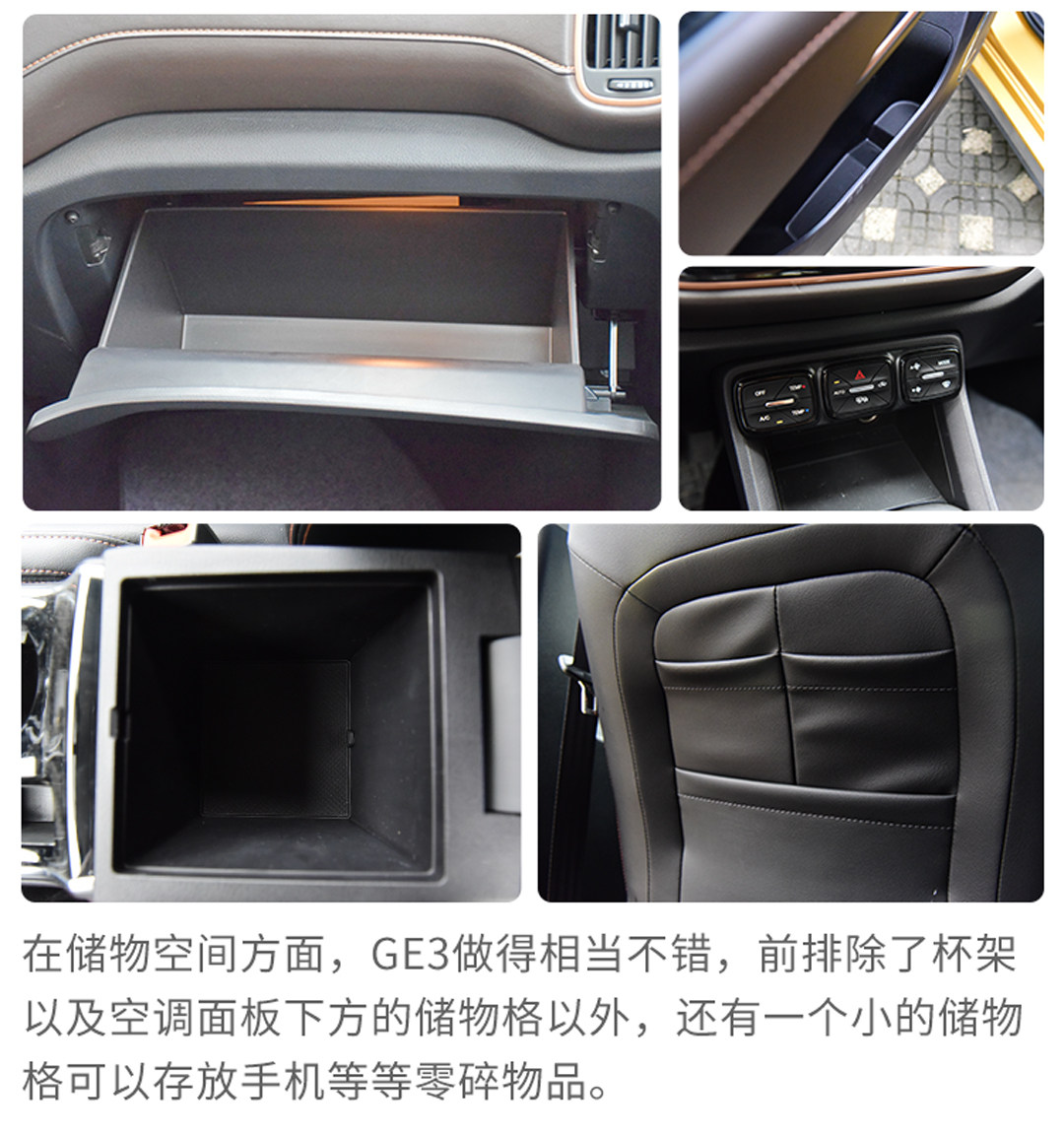 在储物空间方面,GE3的表现也相当不俗,前排除了常规的储物空间以外,杯架、杯架旁边的小储物格等等应该有的,而很多车都没有的地方都设计了储物格,在日常使用起来多一个储物格就是多了一份整洁的车厢,对于家用来说是相当重要的。值得一提的是GE3在前排两个座椅背部除了有下方大的储物袋以外,上层还有两个分割开的小储物袋,在长途或者一家人出行的时候,后排乘客的水杯、杂物也有了更多的地方安置,这看似不起眼的地方却是平时后排乘客使用频率较高的东西。