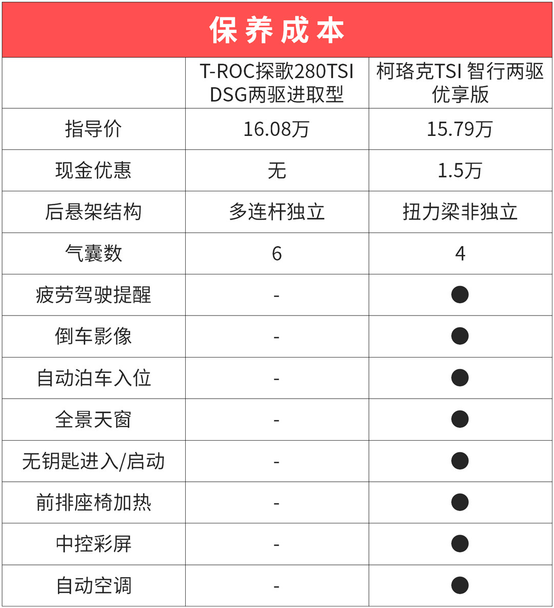 早些年斯柯达的定位要稍低于大众,不过近几年它却表现出了与大众平起平坐的“野望”,定价与同级别的大众持平或者还要高。柯珞克的指导价为13.99-17.74万,而T-ROC-探歌13.58-20.38万,这两辆车都是来自MQB平台,动力总成都是1.2T、1.4T+双离合,柯珞克在各个车款的定价与探歌相当接近了,以国人对品牌的执念来看,柯珞克估计会凉凉?