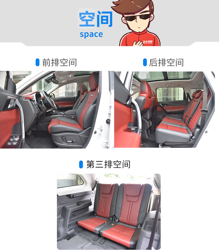 风行T5L的乘坐空间完全对得起大7座的称号,以笔者173cm的身高坐进去,第一排的头部空间有1拳2指;第二排的头部空间有1拳,腿部空间有1掌3指;第三排的头部空间有1拳,腿部空间有3指。