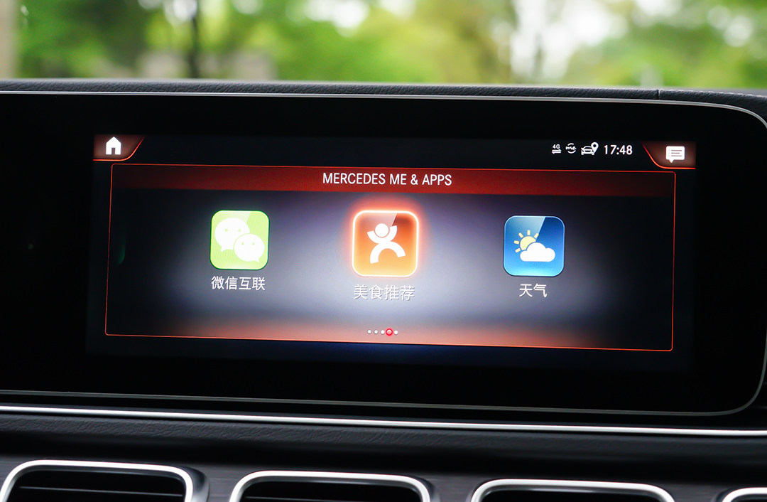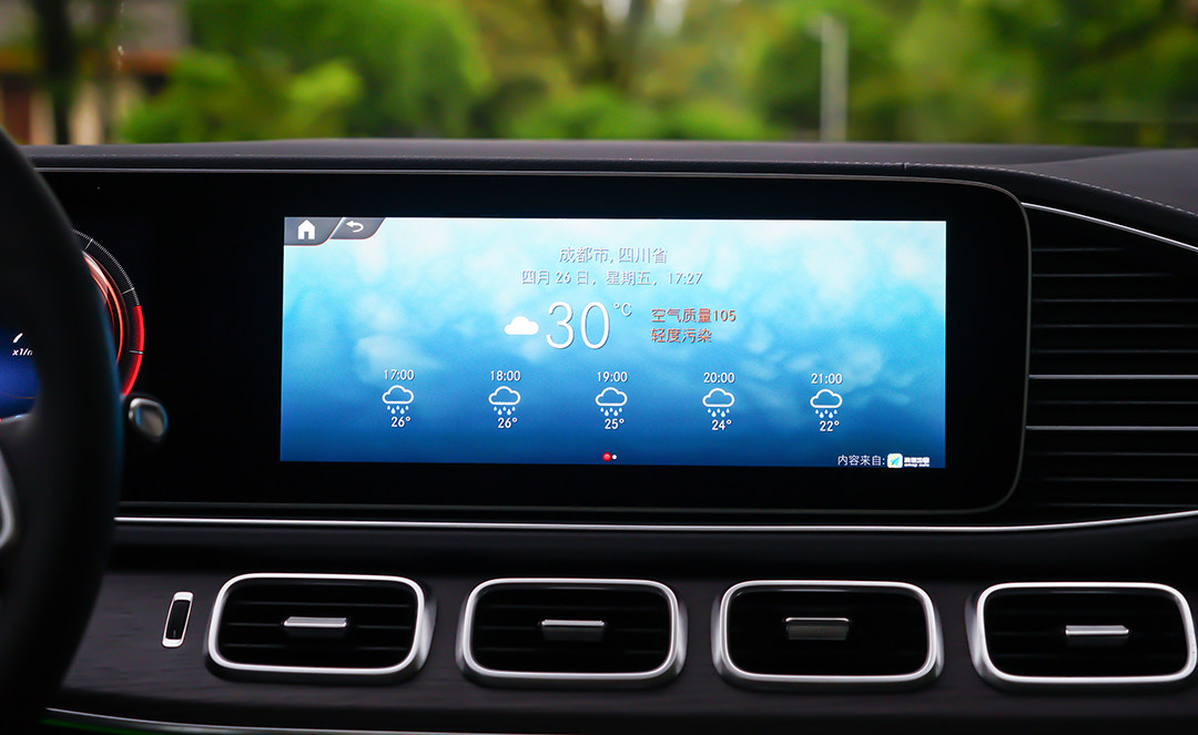 你可以询问车辆天气,它会显示详细天气状况,除此以外,我们还能够在GLE上应用到百度地图、大众点评、喜马拉雅等APP,甚至能将自己的微信账户与车辆相连接,以往我们习惯说的“最懂中国消费者的还是中国品牌”,在此刻被无情推翻。