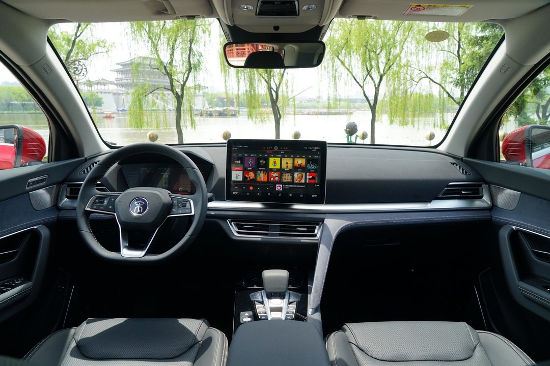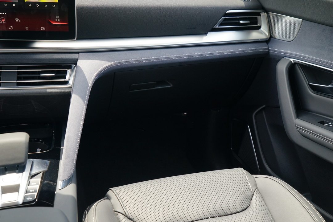 进入车内,首先就能感觉到宋Pro的车厢才用了环抱式布局,内饰的整体同样简洁,中控大屏偏向驾驶员7°,在副驾驶处还新增了扶手,就这样简单的几笔,让车厢的设计感突出了很多。除此之外,宋Pro的用料表现同样可圈可点,车门上沿和中控台整体都为软质搪塑材料,其它位置则使用了带有双缝线的Alcantara和皮革包裹,档次够高。