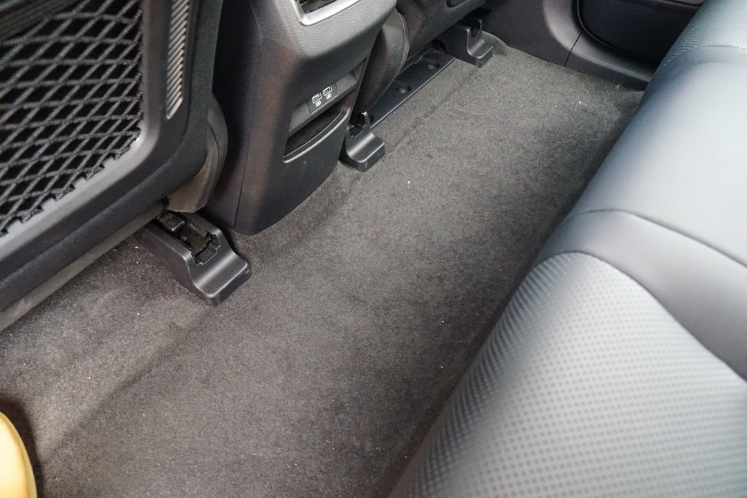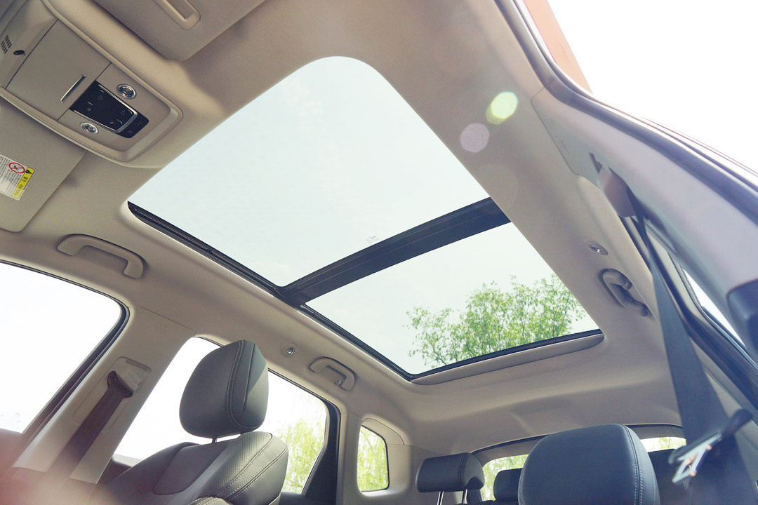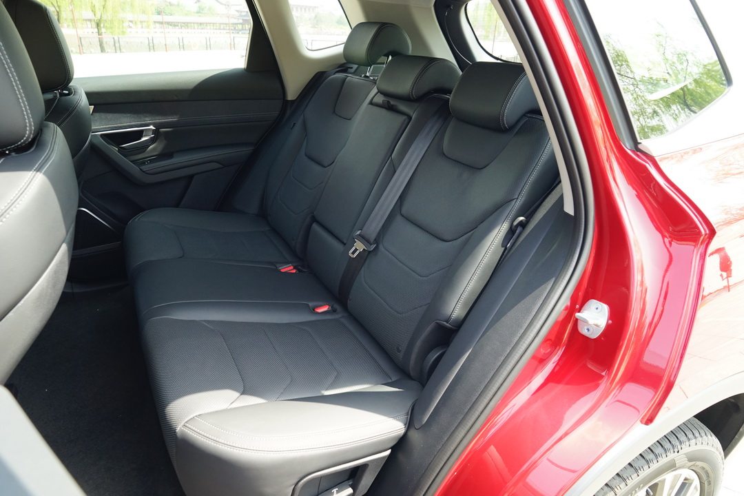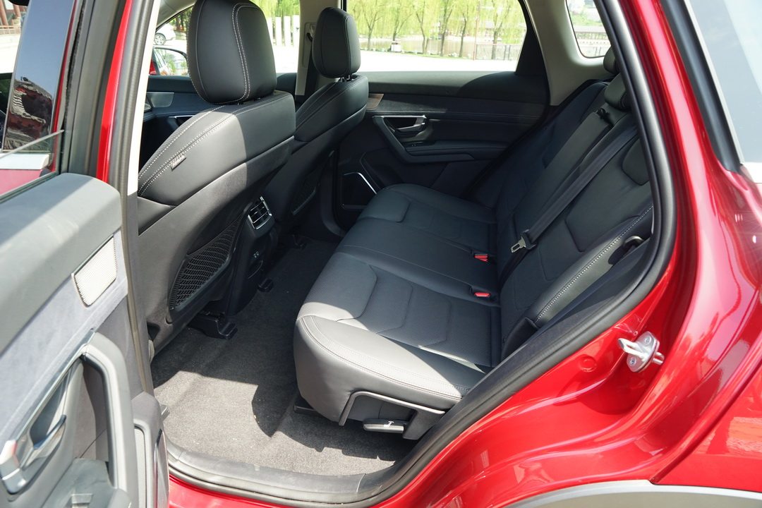 空间表现是笔者最满意的地方,以我173cm的身高为例,后排能有超过两拳的腿部空间,头部空间超过一拳。座椅偏软,靠背角度支持调节,坐垫对大腿的支撑也是足够的,中间座位比较硬,但头枕没有缺席,地板也是完全平整的。全景天窗可以延伸到后排乘客的头顶位置,开扬感我想也不用多说了。