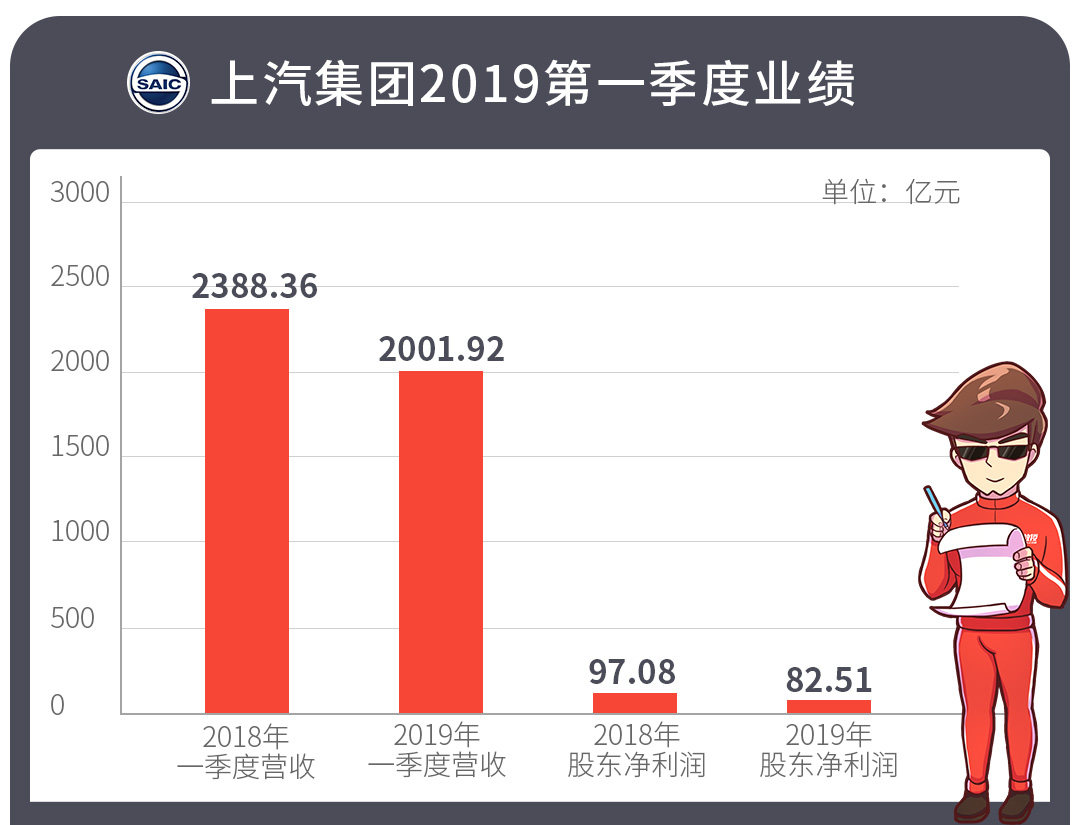 上汽集团2019年第一季度总营收为2001.92亿元,同比减少16.18%,相当于蒸发了380亿元左右。可即便如此,2019年第一季度上汽集团的股东净利润还是达到了82.51亿元,先让我用手指数一下有几个零。