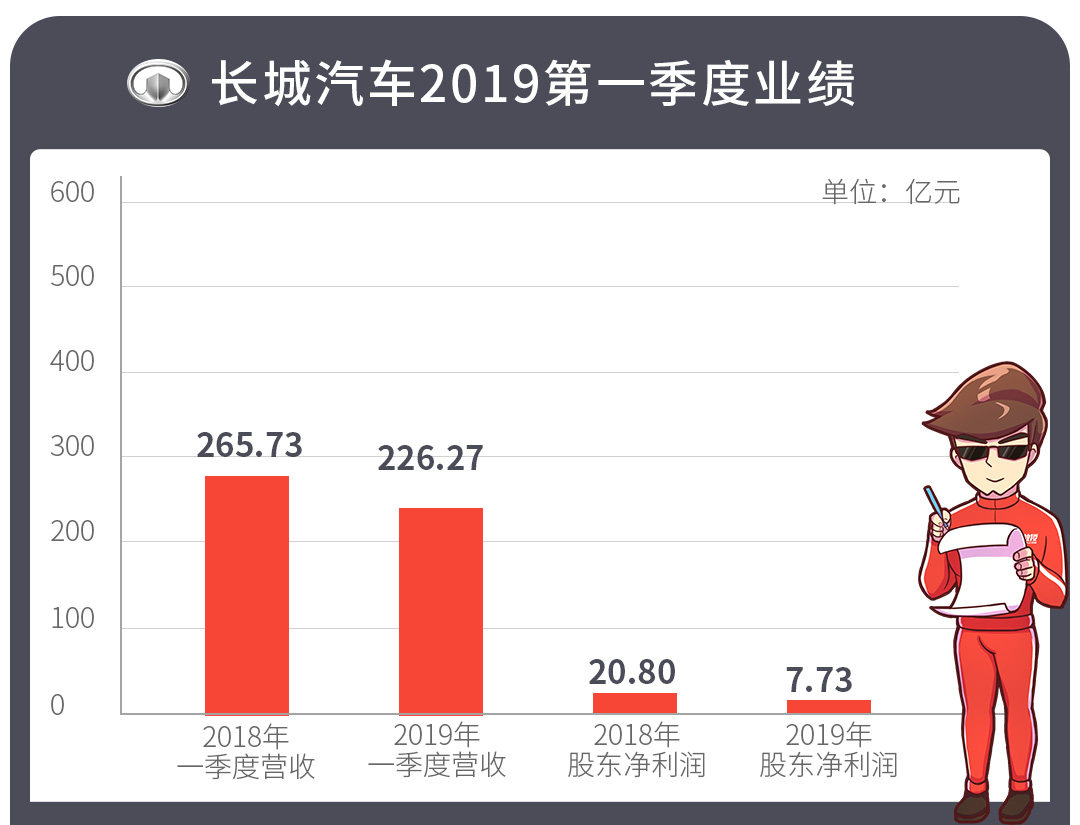 长城汽车2019年一季度总收入约226.27亿元,同比下降14.85%。归属于上市公司股东的净利润约为7.73亿元,同比下降62.84%。