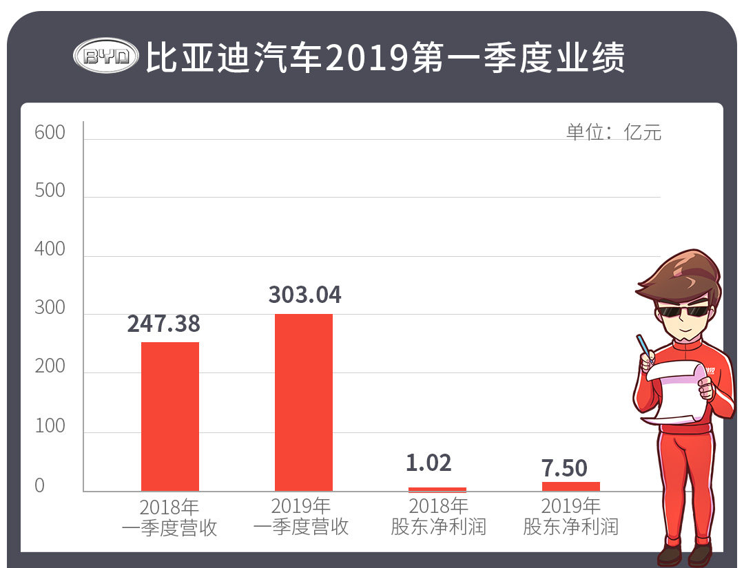 比亚迪2019年一季营业收入303.04亿元,同比增长22.5%。归属于上市公司股东的净利润7.50亿元,同比增长631.98%。