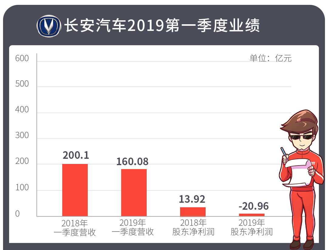 长安汽车2019年一季度实现营收160.08亿元,同比下滑20.00%。净利润亏损20.96亿元,上年同期盈利13.92亿元。