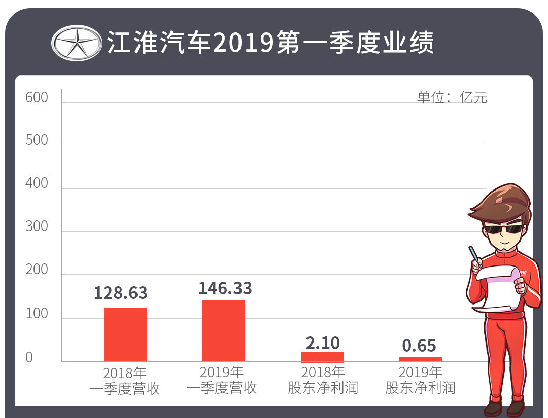 江淮汽车2019年第一季度实现营业收入约为146.33亿元,同比增长13.76%。归属于上市公司股东的净利润约为0.65亿元,同比下降69.13%。