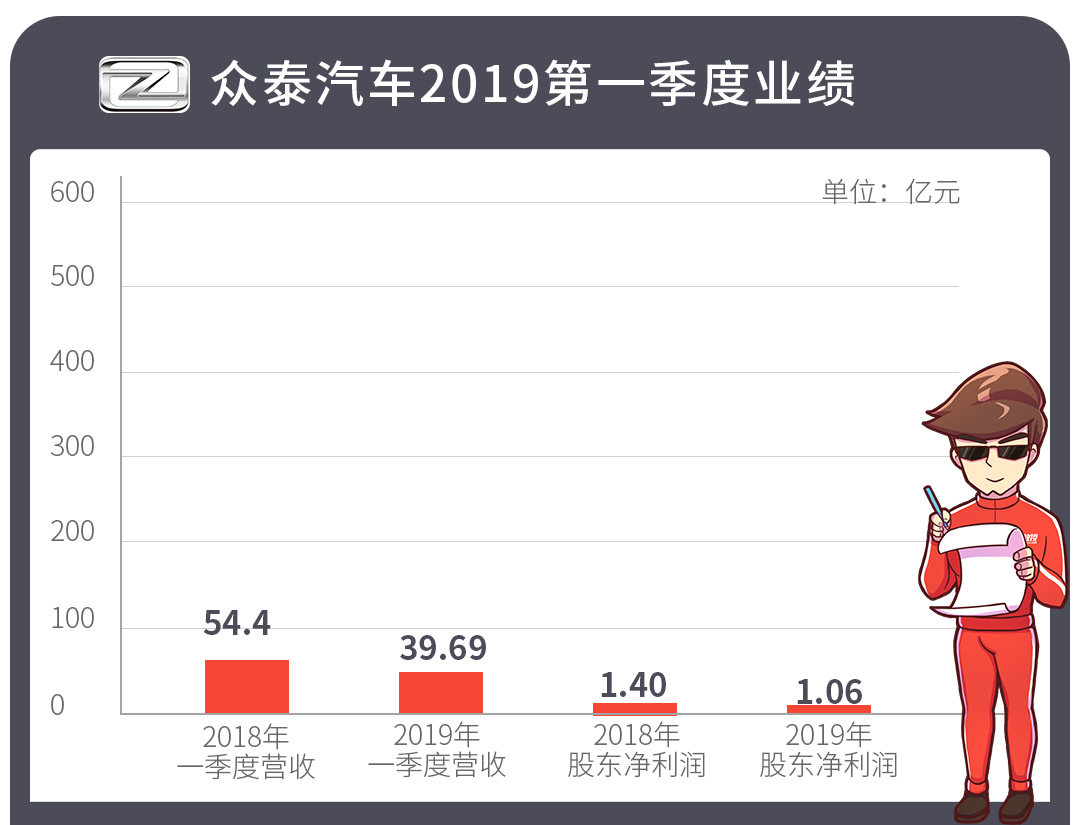 众泰汽车发布2019年第一季度报告,实现营业收入39.69亿元,同比下降27.11%;归属于上市公司股东的净利润1.06亿元,同比下降24.85%。。