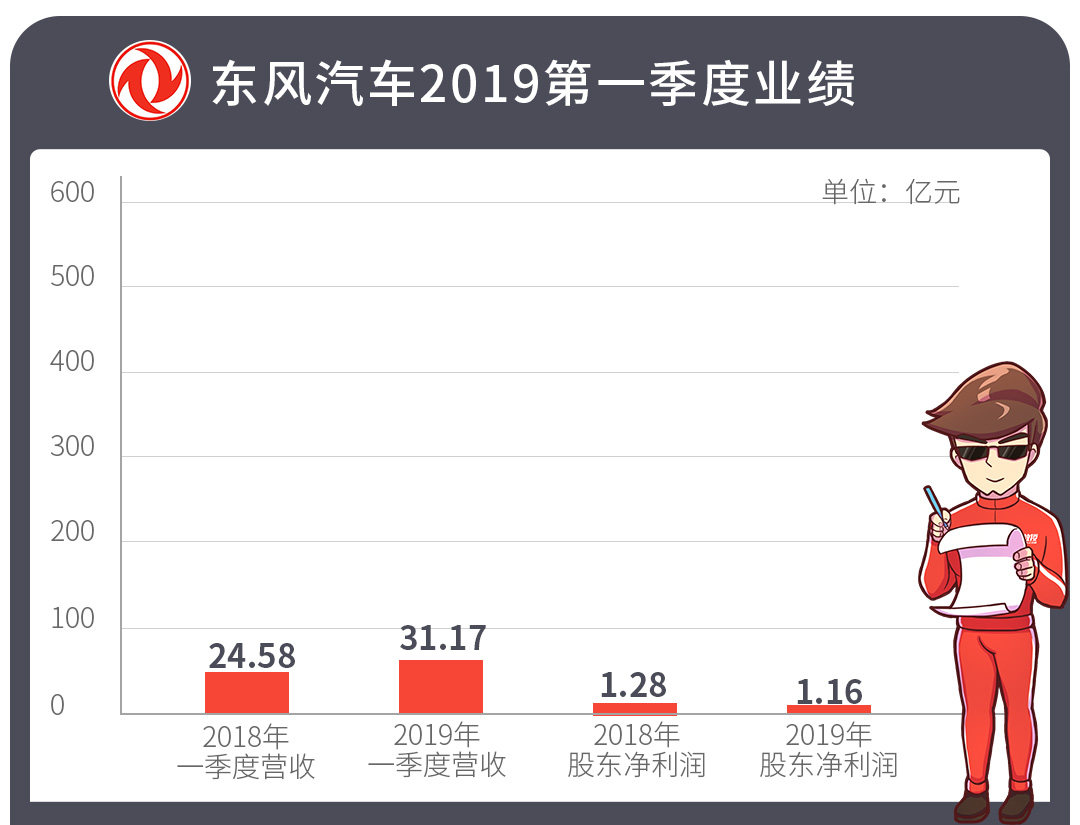 东风汽车2019年一季度营收约31.17亿元,同比增长26.82%。归属于上市公司股东的净利润约为1.16亿元,同比减少10.4%。