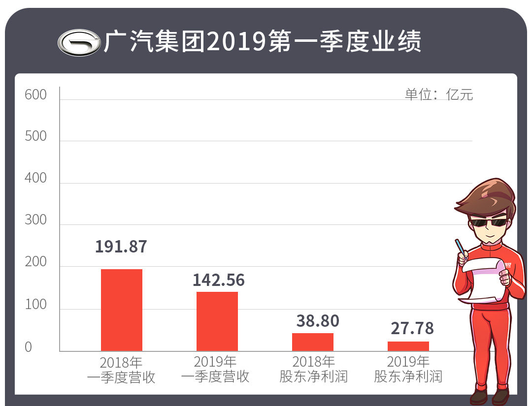 广汽集团2019年一季度营收为142.56亿,下降25.74%。归属于上市公司股东的净利润27.78亿元,同比下降28.40%。(该数据并不是整体数据)
