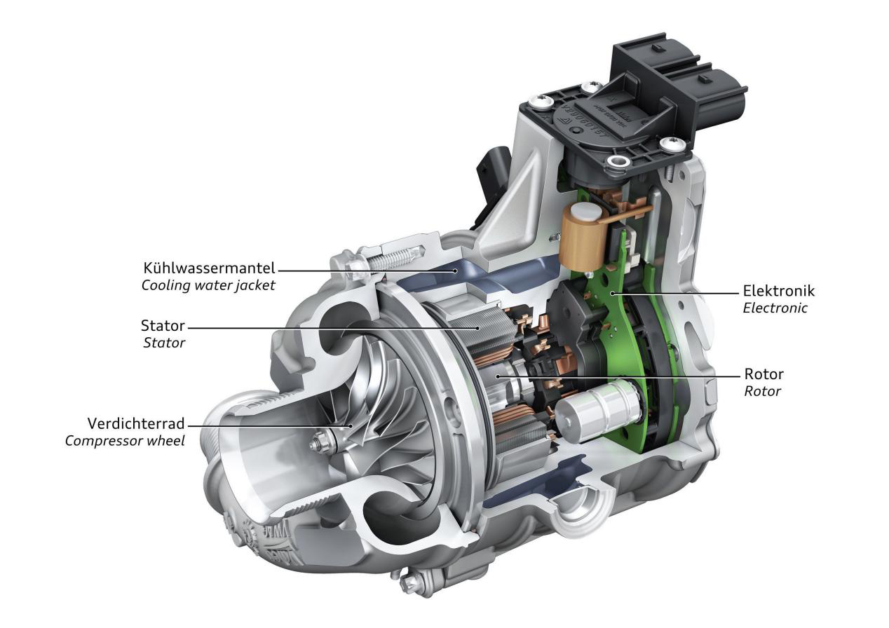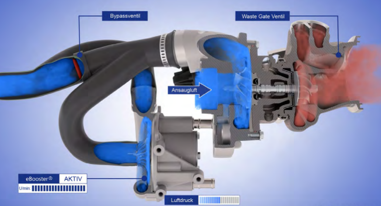电动涡轮增压器功率大概3千瓦,最高转速70000rpm,如果把它并联到进气总管上,就可以在废气涡轮介入工作前,短暂弥补涡轮迟滞。由于不用担心大号涡轮的迟滞,于是可以进一步压榨动力。