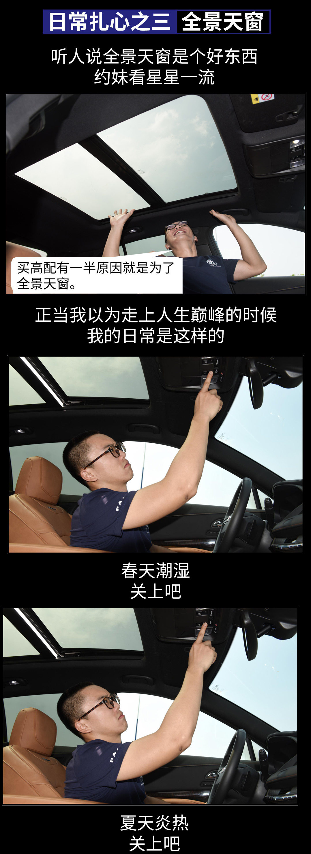 现在越来越多车型的高配加上了主动刹车、车道偏离预警、全景天窗这些看上去很美的配置。这几样配置的实际感受在现阶段多数车型里都不太好(新科技配置优化总需要一个过程),因此在购车的时候,如果需要买高配车,真的需要多问问车主的使用体验。