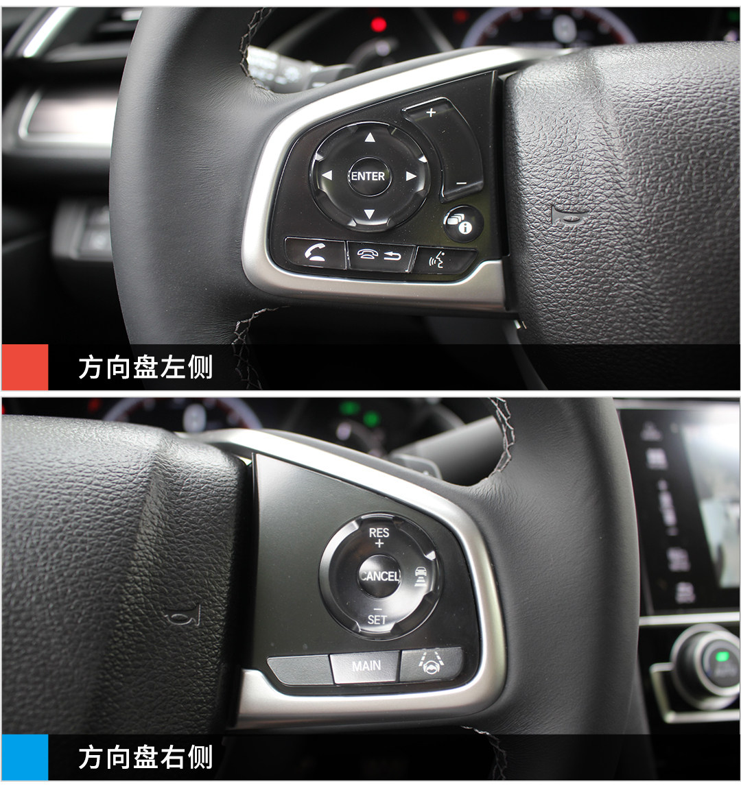 三幅式的多功能方向盘上,左边是常规的音量、电话、语音指示等按钮,右边是Honda SENSING安全超感系统,可惜中低配车型身上没有Honda SENSING,右边成了一块黑色塑料面板,方向盘左右不对称,略显尴尬。