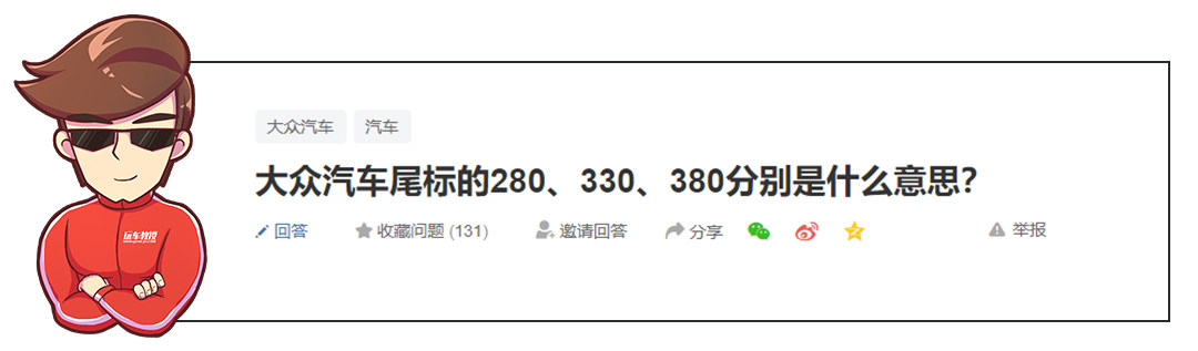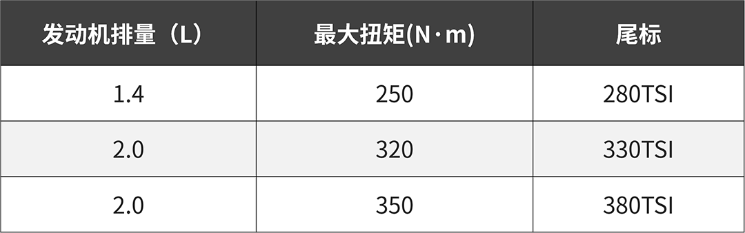 排量1.4L的发动机最大扭矩为250牛米,四舍五入为280(已经很克制不标300了);2.0排量的低功率发动机扭矩为320牛米,尾标为330,高功率版本扭矩为350,对应尾标为380。TSI则表示涡轮增压和缸内直喷技术。