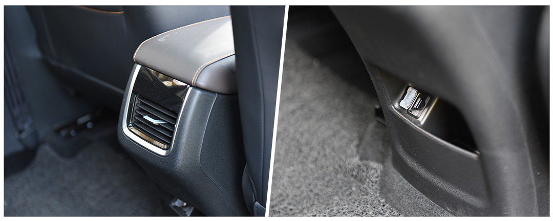 后排“恩物”的独立出风口和USB接口如愿出现,只不过USB接口的位置被设置得过于贴近地板,操作起来并不方便,如果可以整合到出风口处会更合理。而且只有单个USB接口如果后排乘坐两人的手机同时没电,难道要猜拳来决定谁能取得充电权?