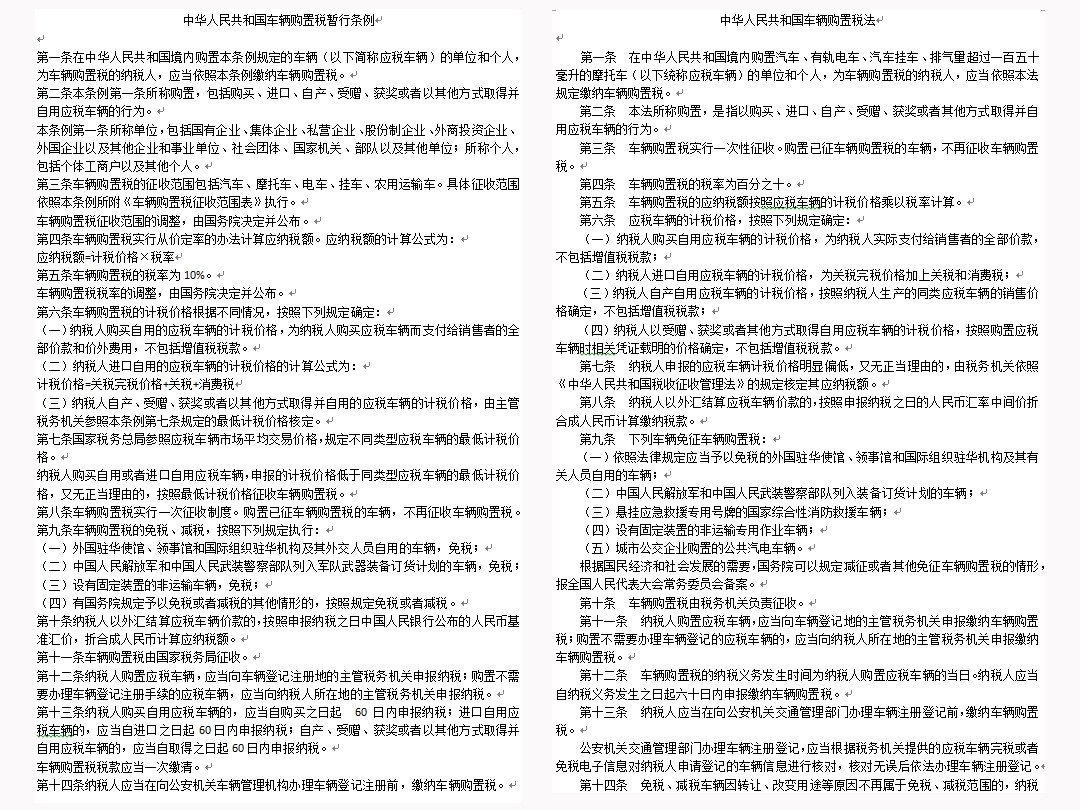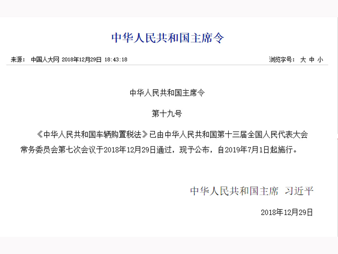 《中华人民共和国车辆购置税法》(以下简称《税法》)由中华人民共和国第十三届全国人大常务委员会第七次会议于2018年12月29日通过并公布,共十九条,自2019年7月1日起施行。而2000年10月22日国务院公布的《中华人民共和国车辆购置税暂行条例》(以下简称《条例》)同时废止。