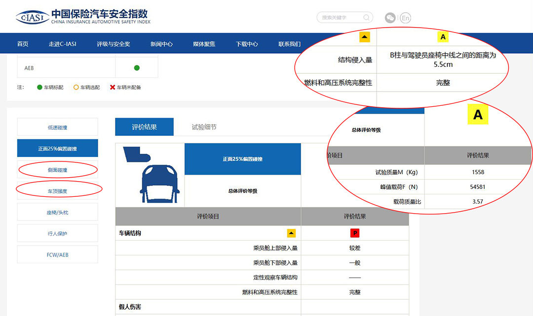 除了安全气囊外,车身结构、强度恰恰是我们很多人不知道如何判别的地方。同样是看正面碰撞、侧面碰撞、车顶碰撞时浸入量,浸入量越少,人越安全。通过西玛的评价结果我们也可以看到,正面碰撞时浸入量比较大,因而其车头位置结构较差;不过侧面碰撞和车顶碰撞都取得了A,这两个部分的结构还是比较好的。