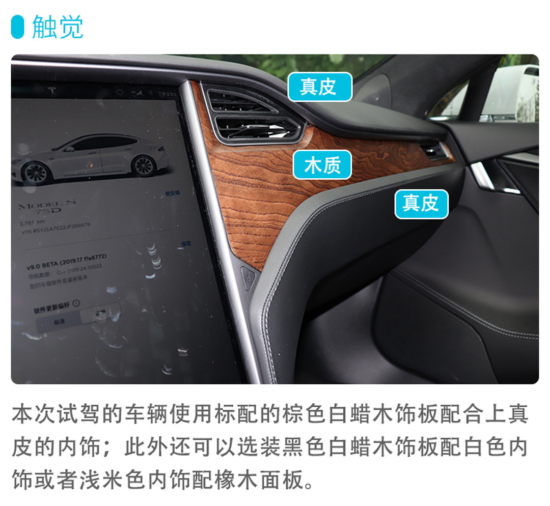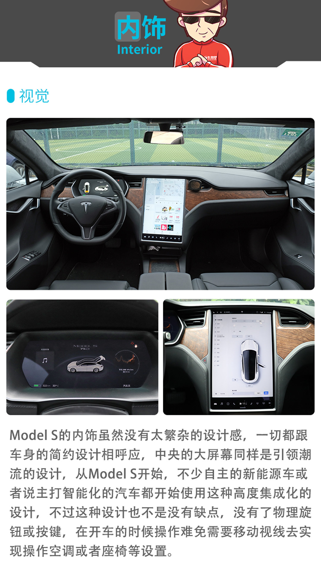 内饰方面,Model S同样是在当时引领潮流,不仅仅是那个高达17英寸的高清触控屏,更重要的是车机系统以及高度集成化的体验,是以前所有的车机都未曾尝试的,这样做的最大好处就是能够将车里的设计变得简洁,但缺点也是相当明显,在驾驶过程中如果需要盲操作一些常用的功能,例如空调或者车辆驾驶模式的切换,需要点击屏幕里切换,当你按完几个按钮,选择完车辆的设置以后,你那小小的激情早已消逝。不过这个大屏还有一个值得称赞的地方就是分辨率以及反光上,基本上在试驾过程中屏幕没有出现过由于阳光过于强烈而导致屏幕反光的现象,这一点是需要给予好评的。