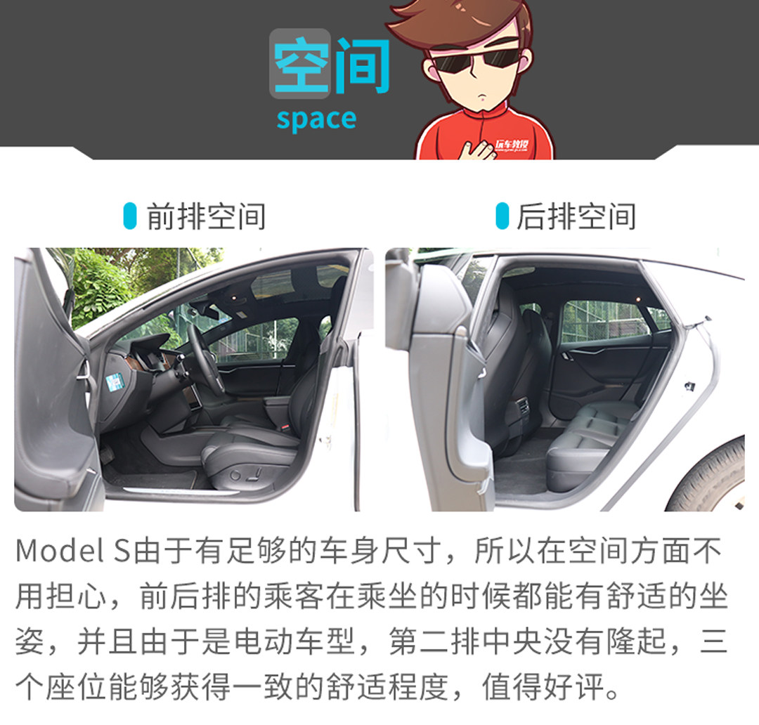 由于Model S是纯电动车型,电池布置在车底,所以车厢内的空间就相当充裕了,无论是前排还是后排,都能够获得足够的空间,即便是第二排中间的乘客,都能获得一个相当舒适的坐姿,毕竟没有了中央通道的隆起,整个地台都是纯平的。