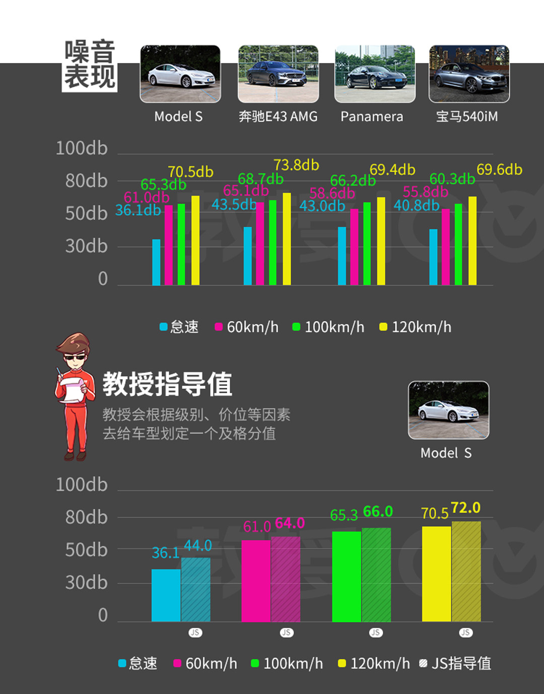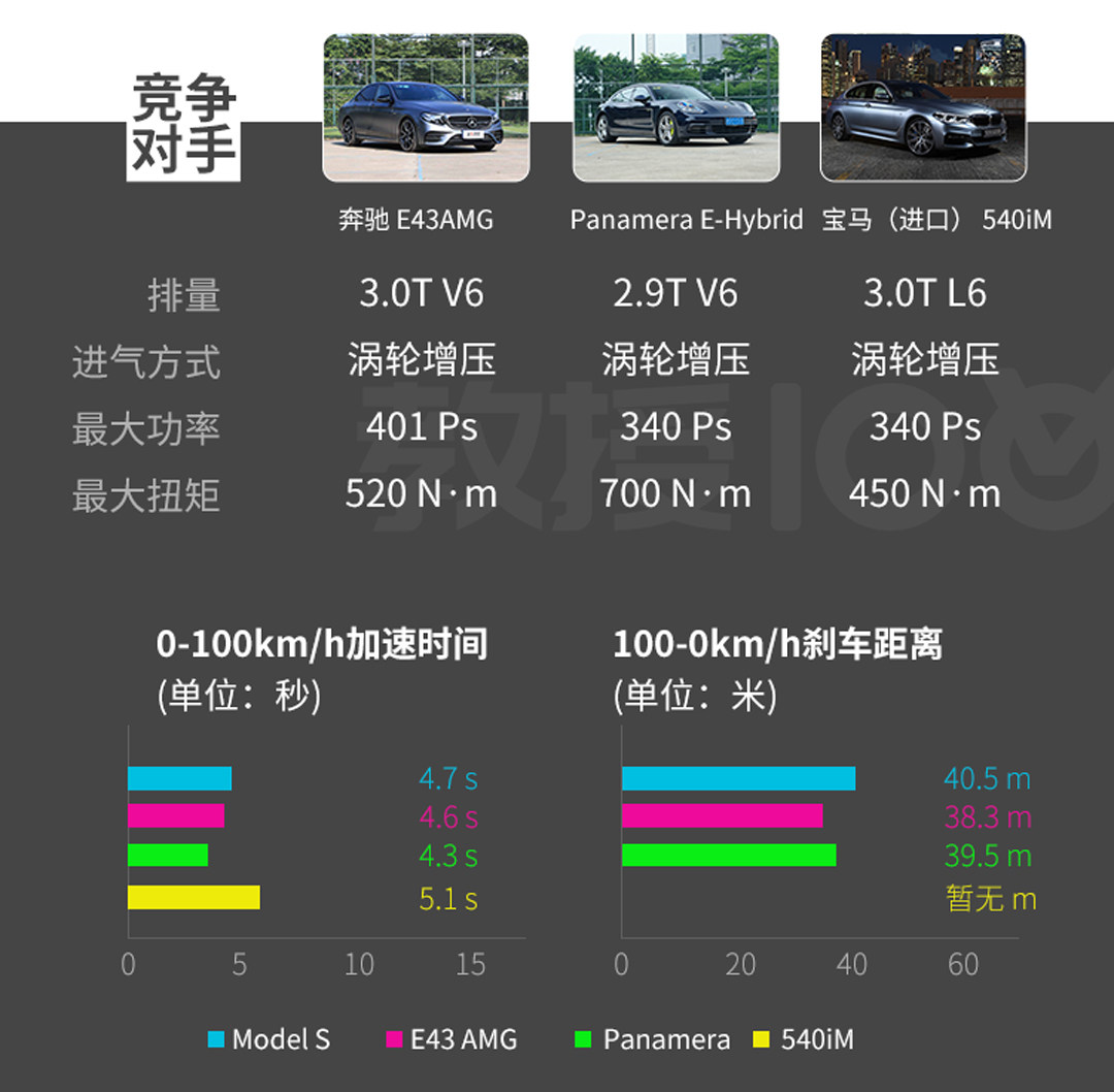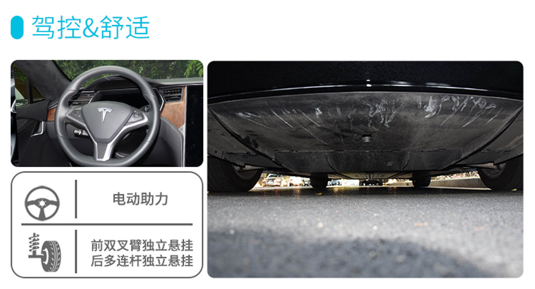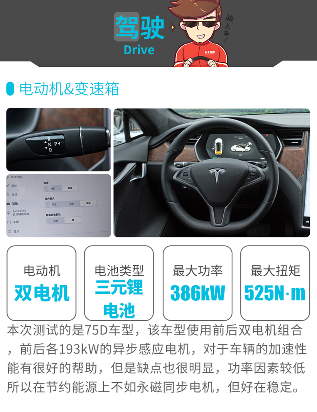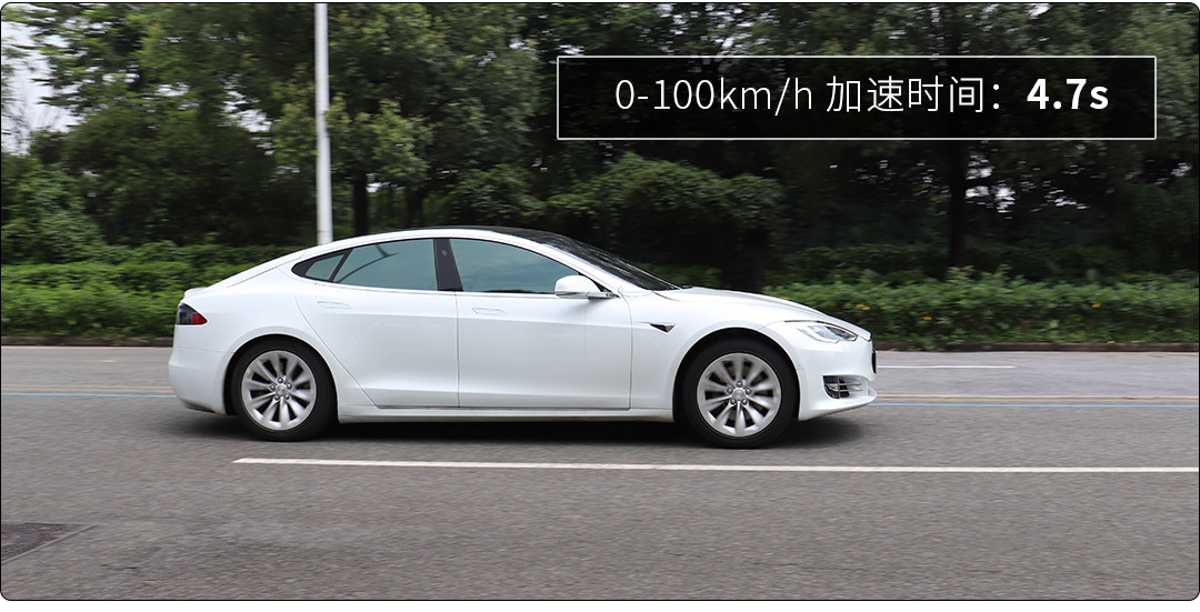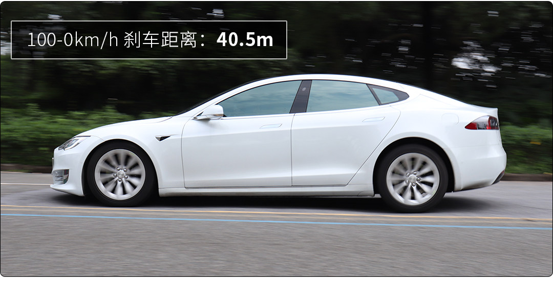 动力性能方面是Model S的长处,由于电动机输出特性关系,Model S的加速性能尤其出色,而本次试驾的75D版本是没有“狂暴模式”所以没有办法使用弹射起步的方式,而并没有因为这样使得成绩落后,百公里加速4.7秒足以跟一众性能车PK一番,由于电动机的特性,车辆没有发动机的轰鸣和变速箱换挡的刺激感,所以急加速的过程只有G值给你“提示”。在刹车测试中,由于车辆使用的是四季胎,并不是主打抓地操控的性能轮胎,所以刹车成绩并不理想,如果更换成更加抓地的轮胎,车辆的刹车性能应该能提升2米。