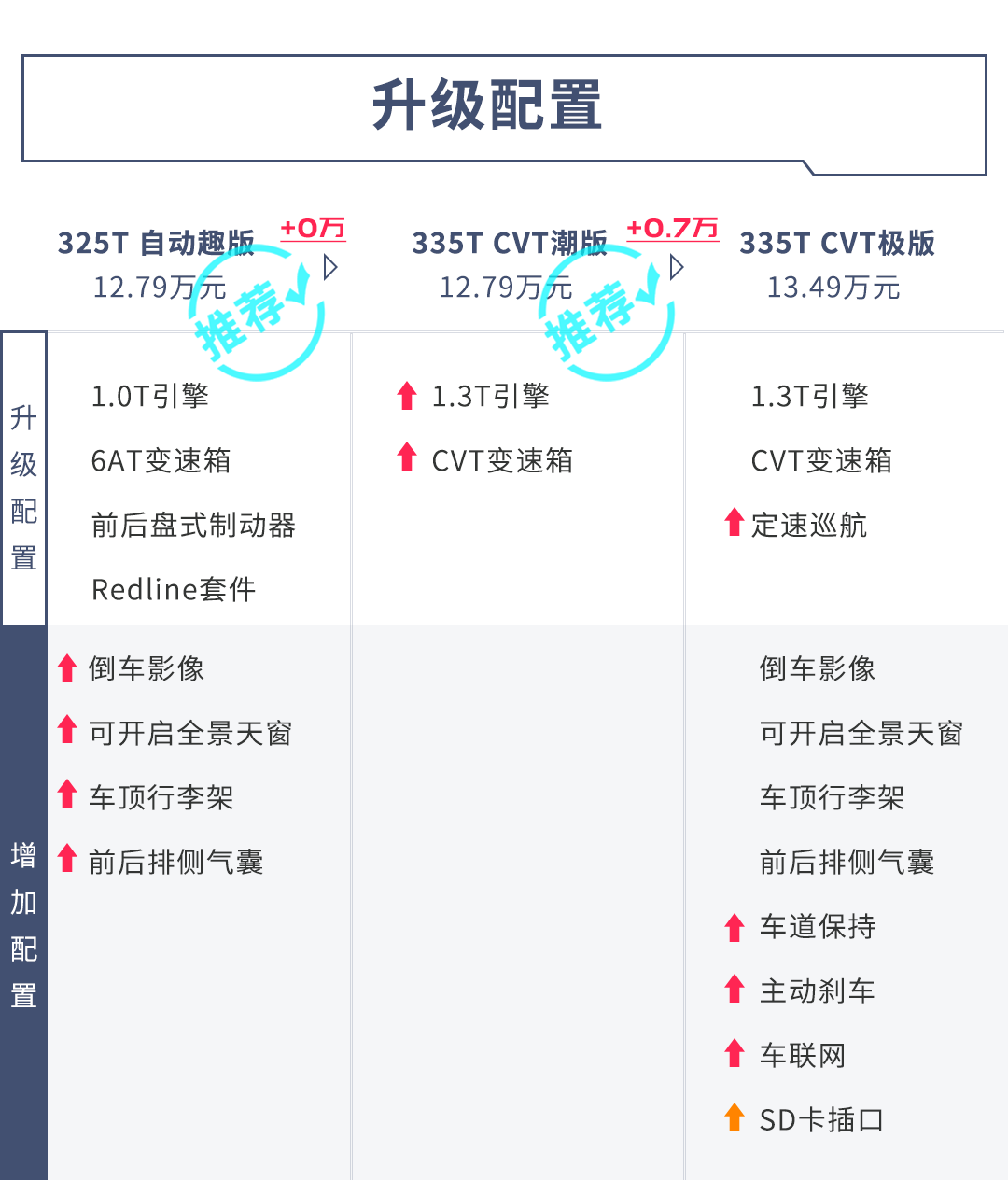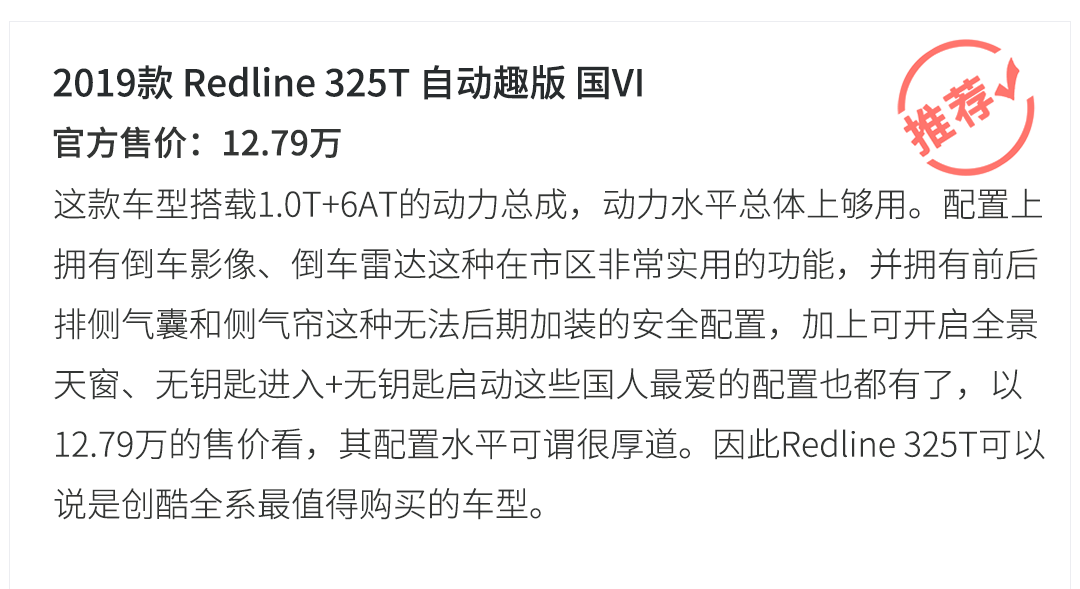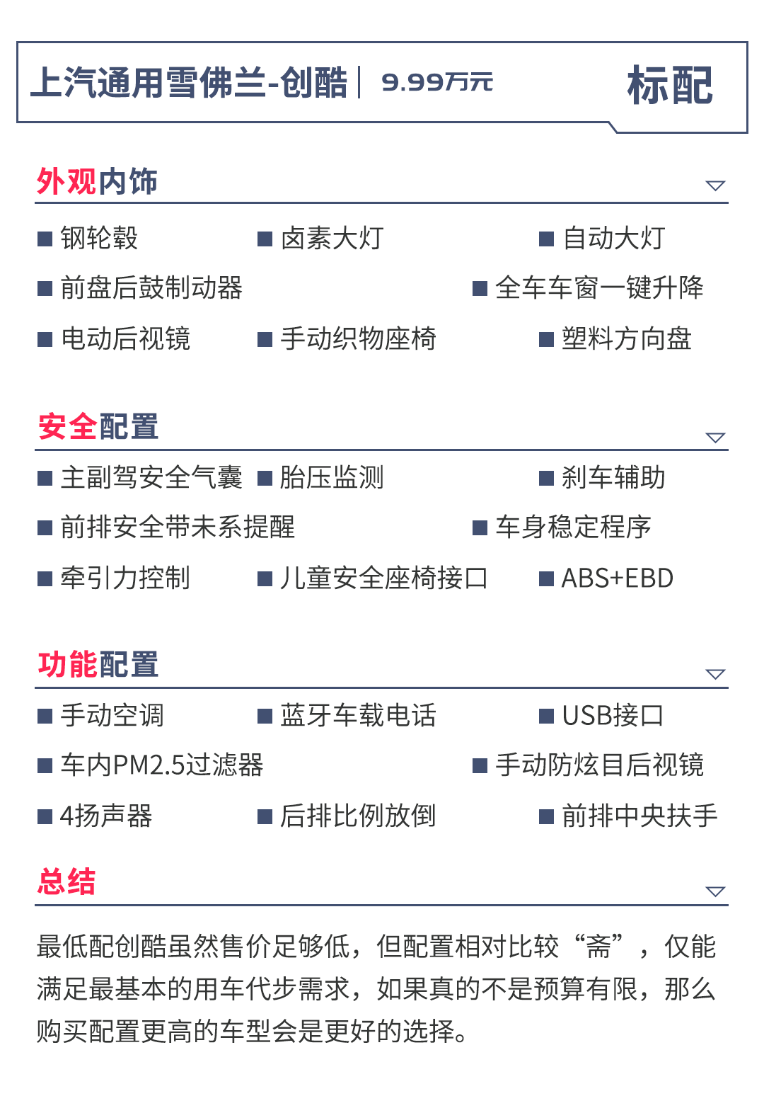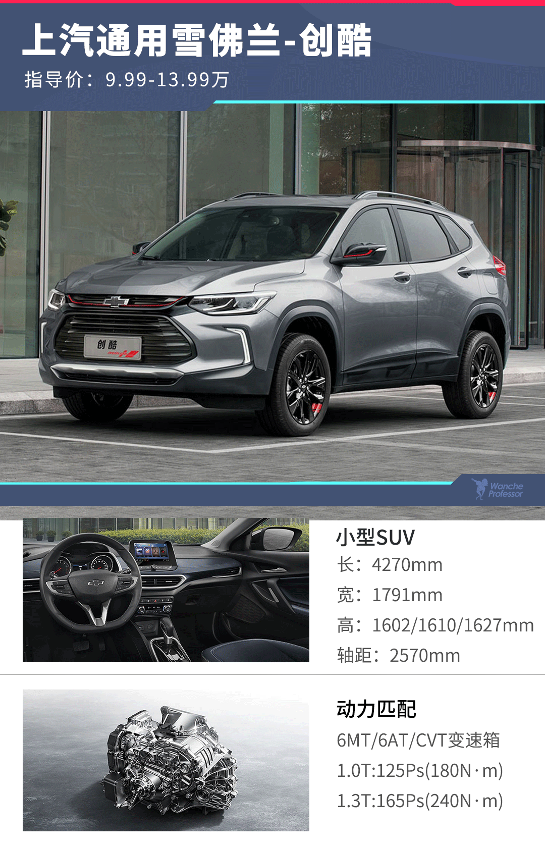 6月5日,上汽通用雪佛兰旗下的小型SUV——全新一代创酷正式上市,新车售价区间为9.99-13.99万元,共推出6款车型,提供1.0T+6MT/6AT与1.3T+CVT的动力选择。创酷本次的换代可谓脱胎换骨,既采用了全新的外观内饰设计,又换装了通用最新的动力总成。那么,哪一款车型配置性价比最高呢?