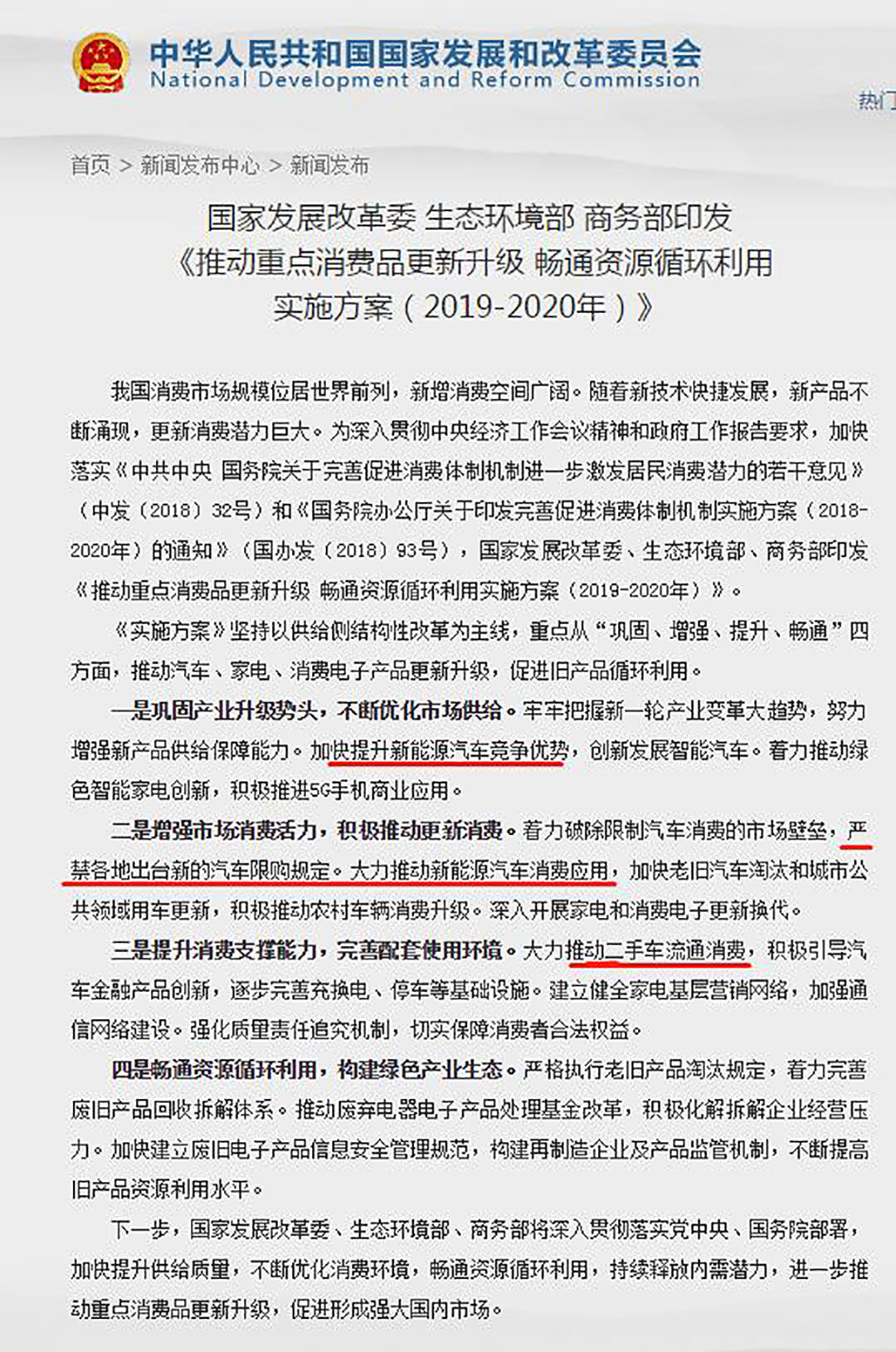 6月6日,国家发改委、环境部、商务部联合发文《推动重点消费品更新升级 畅通资源循环利用实施方案(2019-2020年)》。通知主要包含以下四点:①巩固产业升级势头,不断优化市场供给。加快提升新能源汽车竞争优势,创新发展智能汽车;②增强市场消费活力,积极推动更新消费。着力破除限制汽车消费的市场壁垒,严禁各地出台新的汽车限购规定;③提升消费支撑能力,完善配套使用环境。大力推动二手车流通消费,积极引导汽车金融产品创新,逐步完善充换电、停车等基础设施;④畅通资源循环利用,构建绿色产业生态。通知明确指出,加快提升新能源汽车发展,严禁各地出台新的汽车限购规定,鼓励二手车市场,推动汽车等产品的更新升级,促进旧产品循环利用。